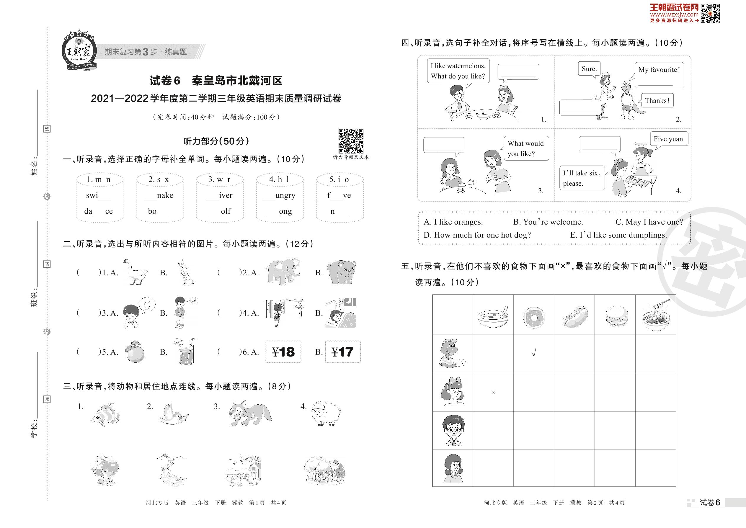 秦皇岛市北戴河区2021—2022学年度第二学期三年级英语期末质量调研试卷(冀教版)【6】