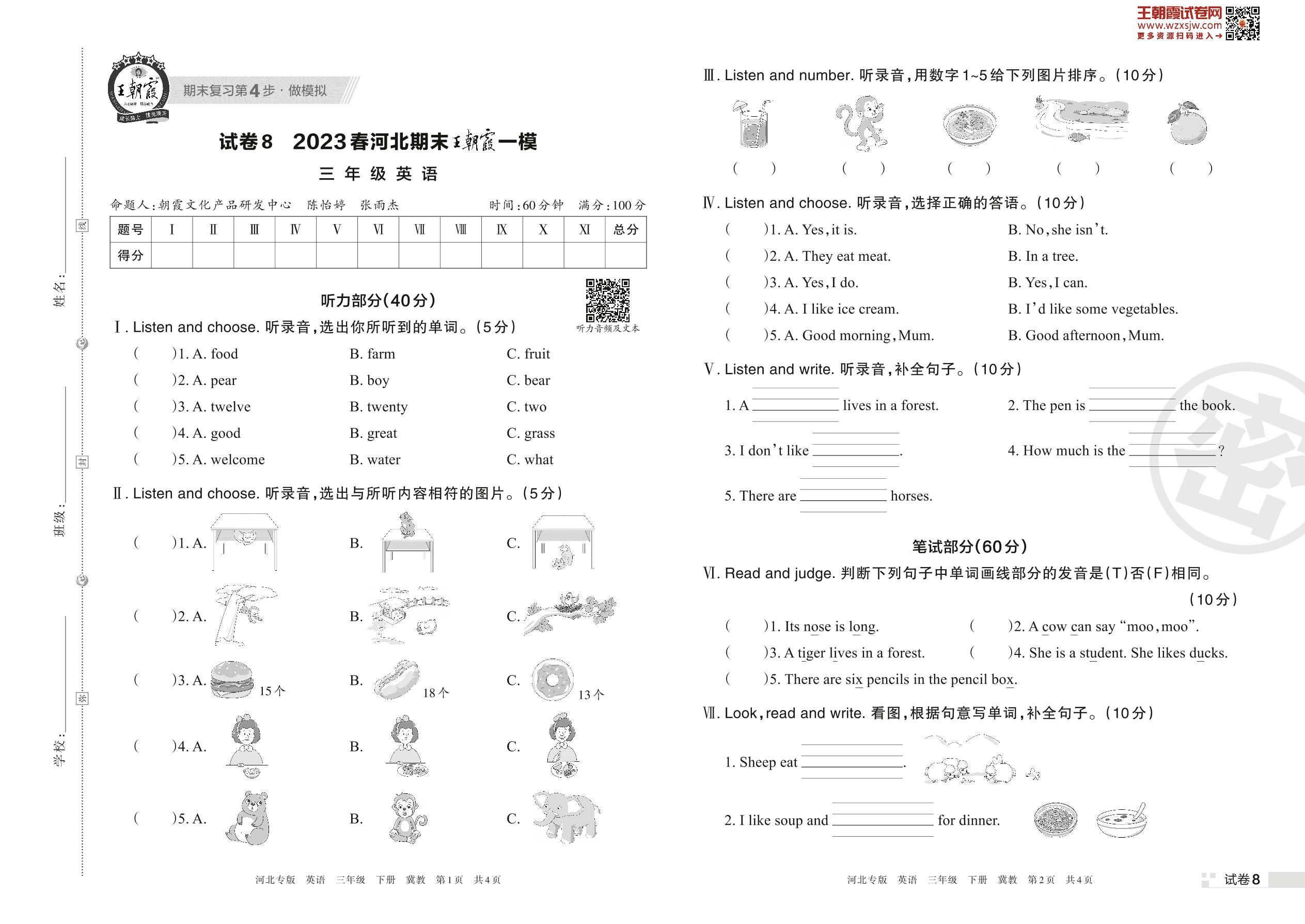 王朝霞期末模拟卷三年级下册英语(冀教版)_R230419154749077【8】