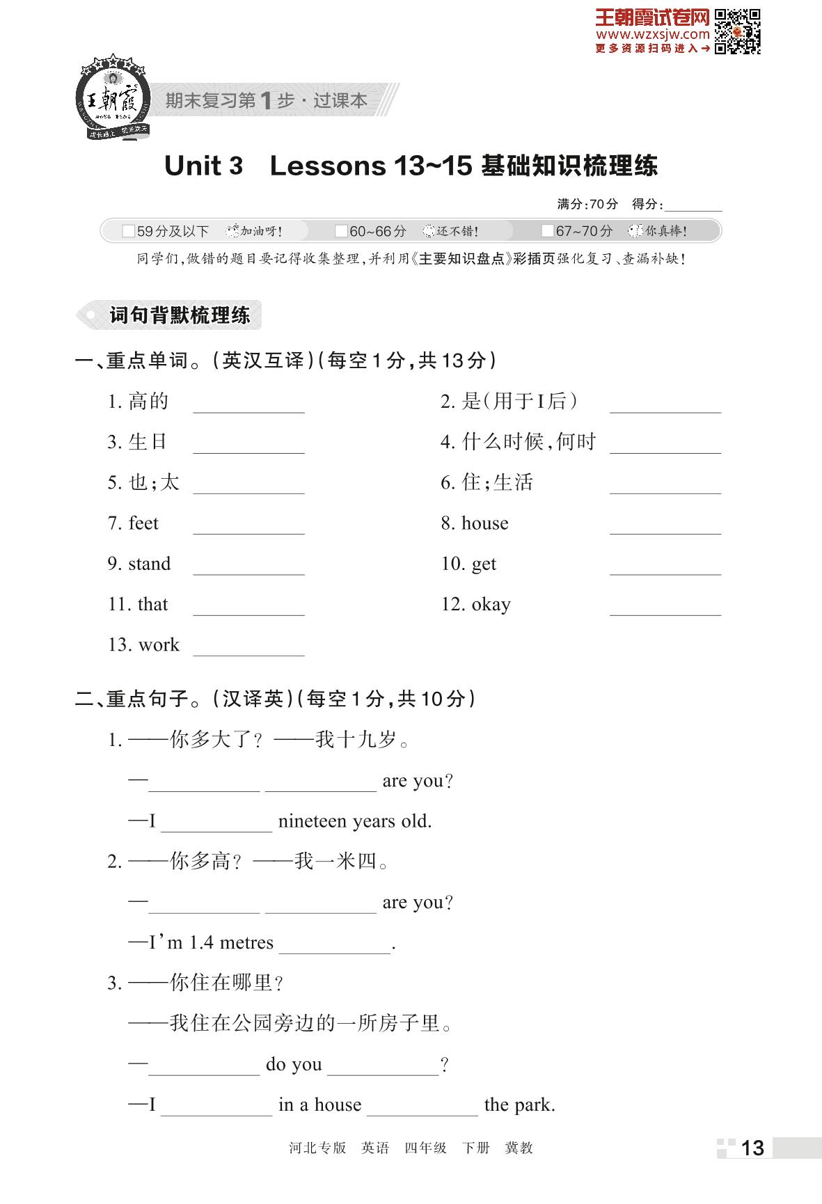 王朝霞期末过课本——Unit 3 Lessons 13~15 基础知识梳理练四年级下册英语(冀教版)