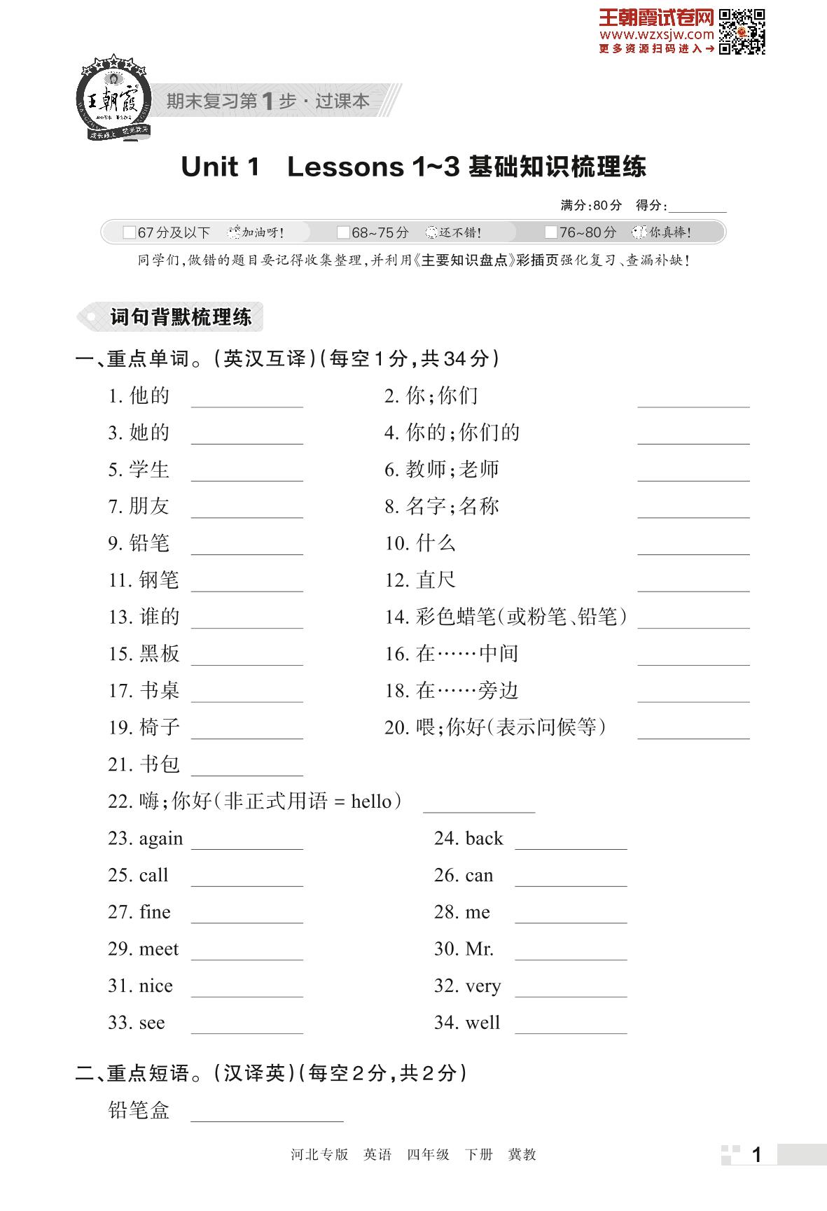 王朝霞期末过课本——Unit 1 Lessons 1~3 基础知识梳理练四年级下册英语(冀教版)