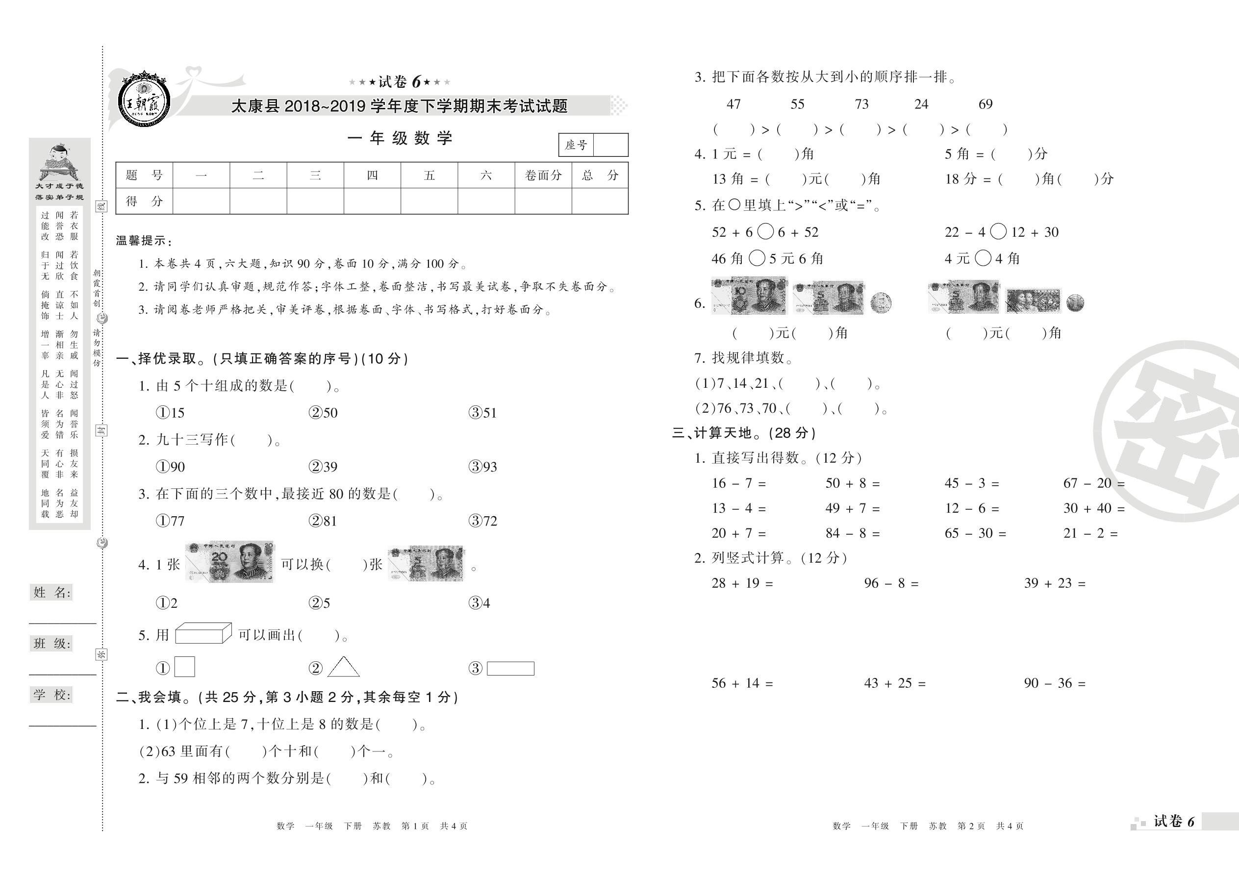 一年级数学苏教版下册期末卷