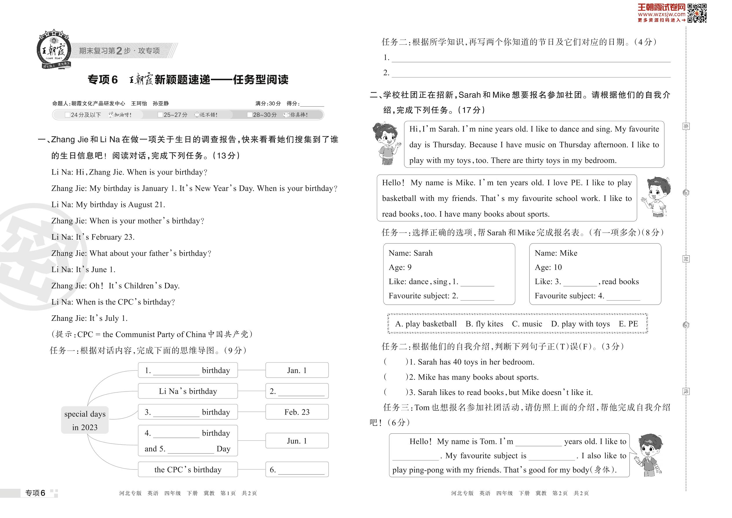 王朝霞期末专项卷——王朝霞新颖题速递:任务型阅读四年级下册英语(冀教版)【6】