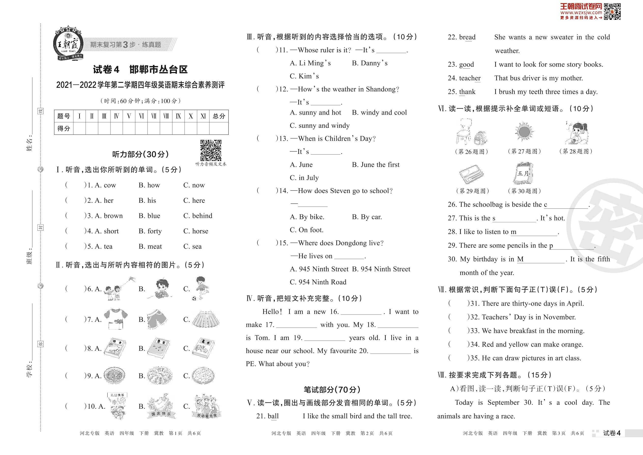 邯郸市丛台区2021—2022学年第二学期四年级英语期末综合素养测评(冀教版)【4】