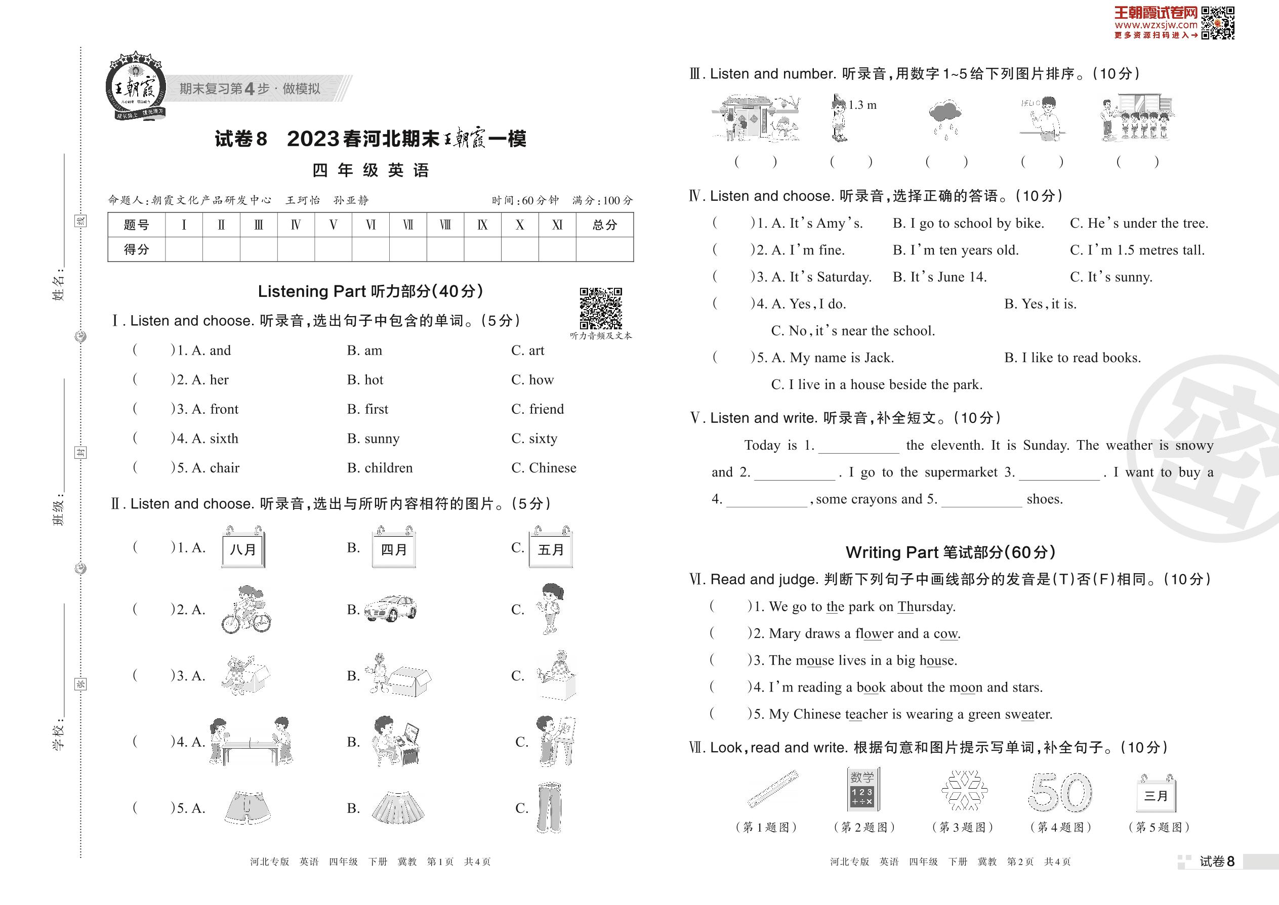 王朝霞期末模拟卷四年级下册英语(冀教版)_R230419155251474【8】