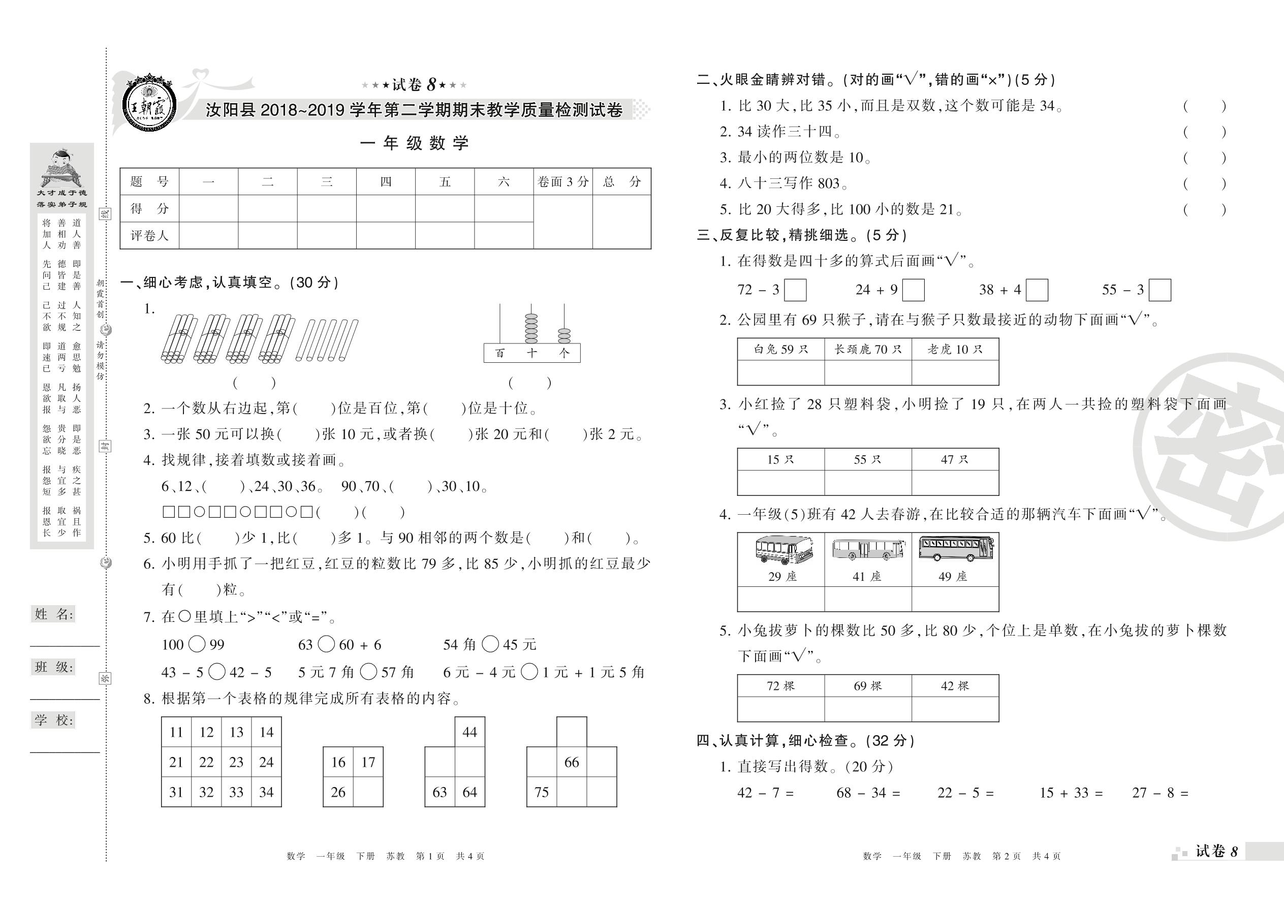 2018-2019学年第二学期洛阳市汝阳县一年级数学试卷(苏教版)【8】