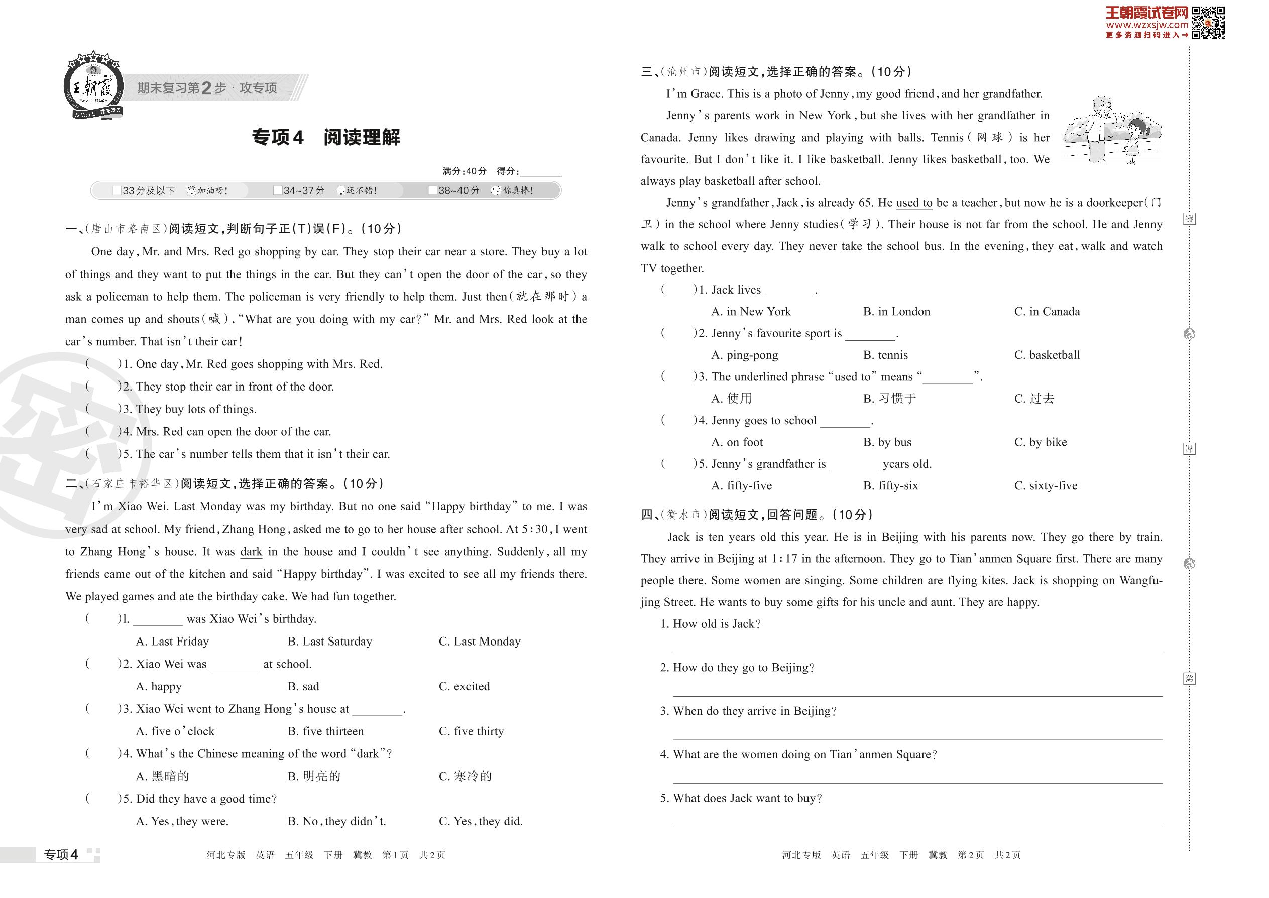王朝霞期末专项卷——阅读理解五年级下册英语(冀教版)_R230419155742509【4】
