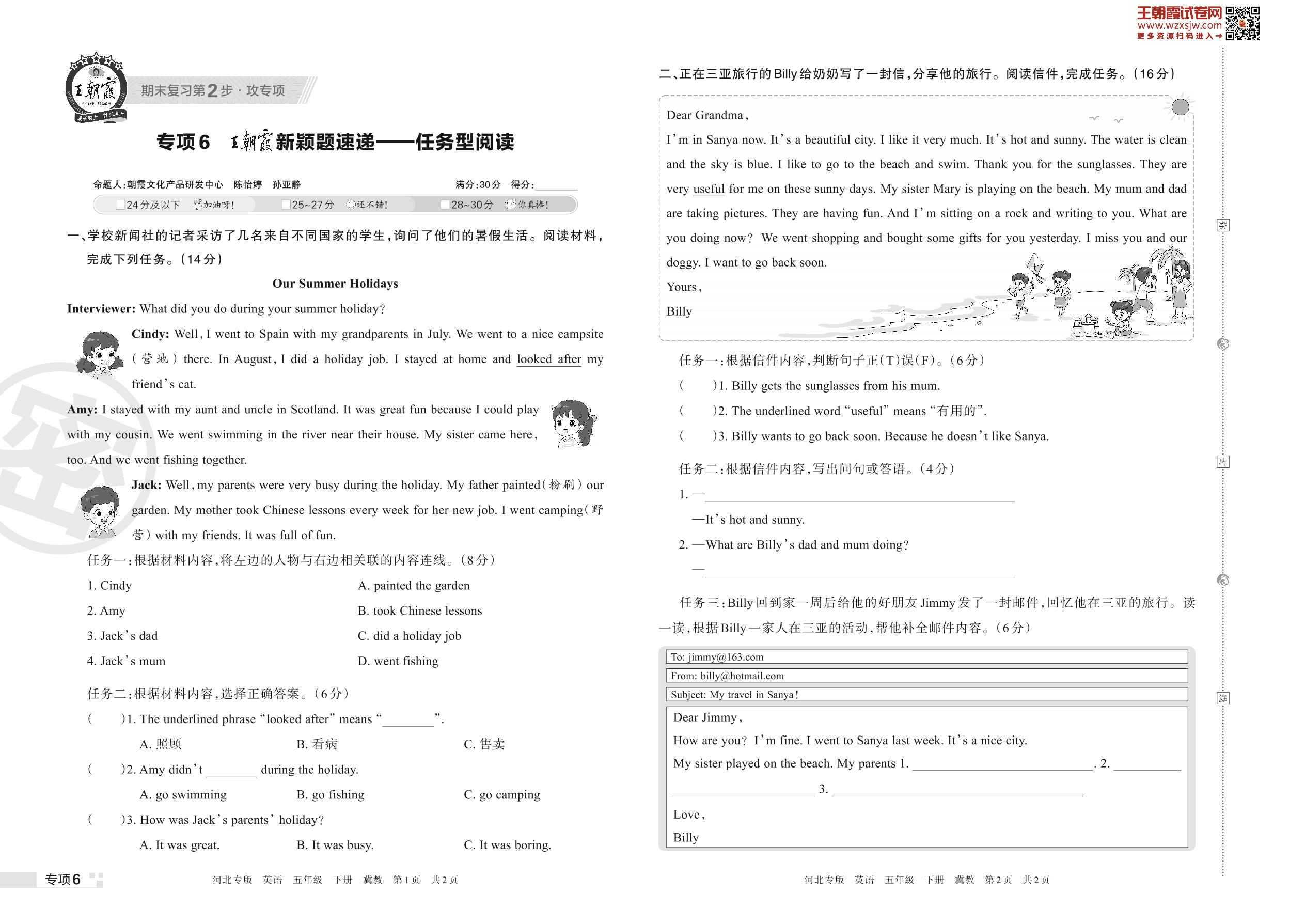 王朝霞期末专项卷——王朝霞新颖题速递:任务型阅读五年级下册英语(冀教版)【6】