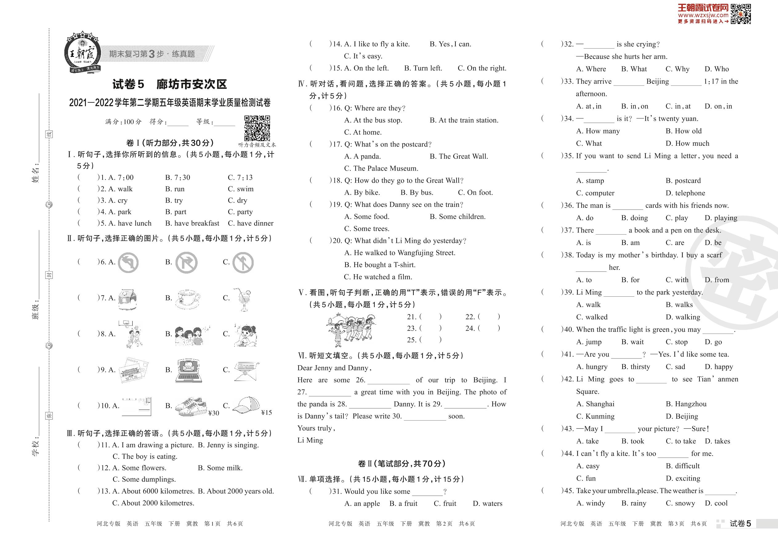 廊坊市安次区2021—2022学年第二学期五年级英语期末学业质量检测试卷(冀教版)【5】
