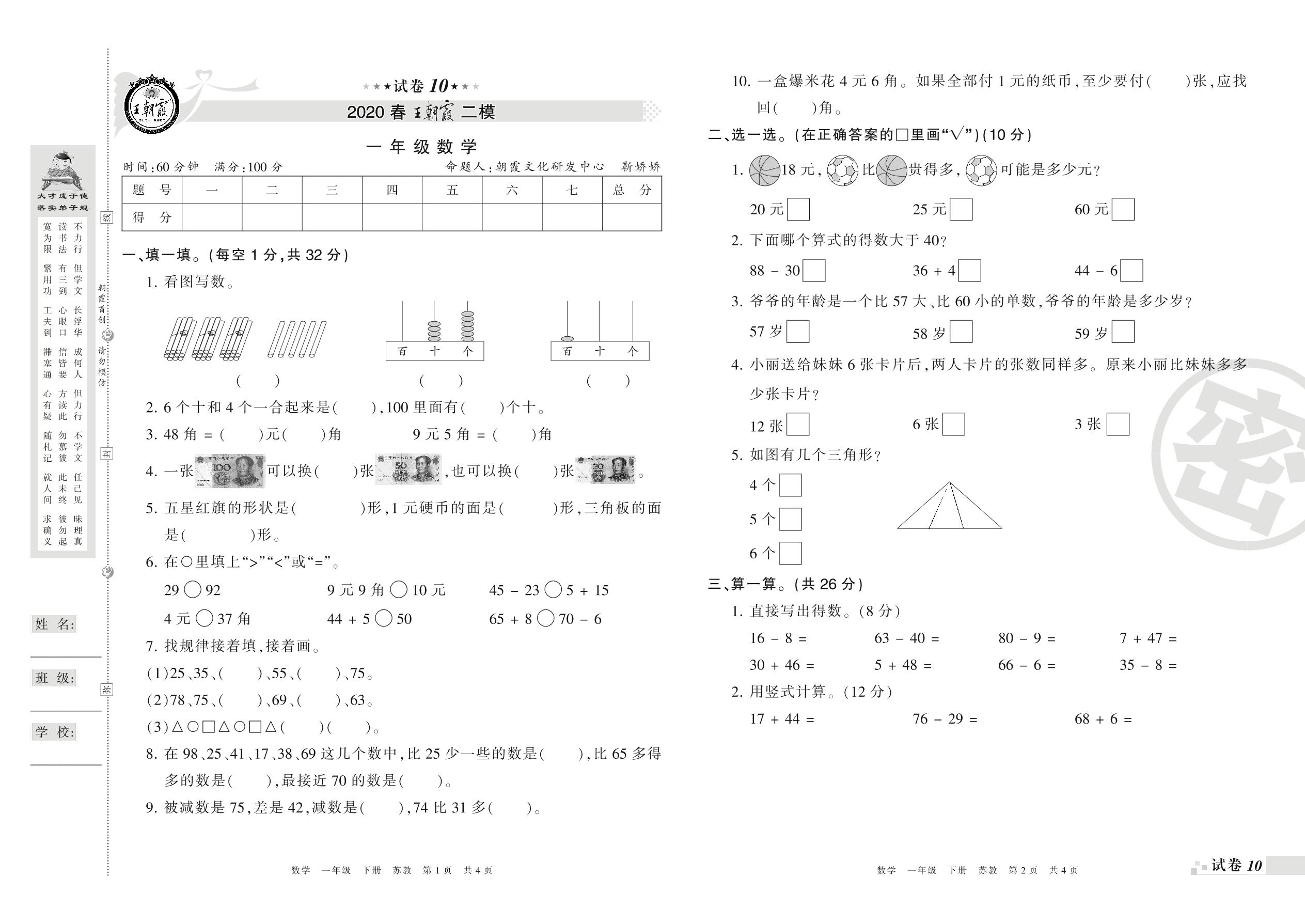王朝霞期末模拟卷一年级下册数学(苏教版)_R210802214240【10】