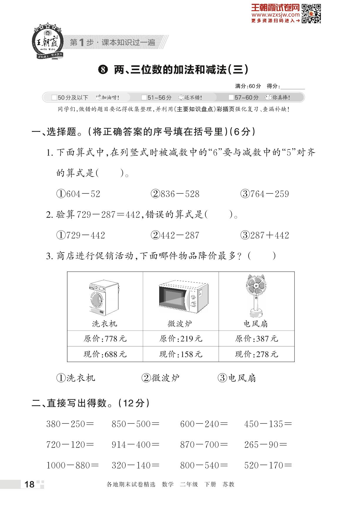 王朝霞期末过课本——8 两、三位数的加法和减法(三)二年级下册数学(苏教版)