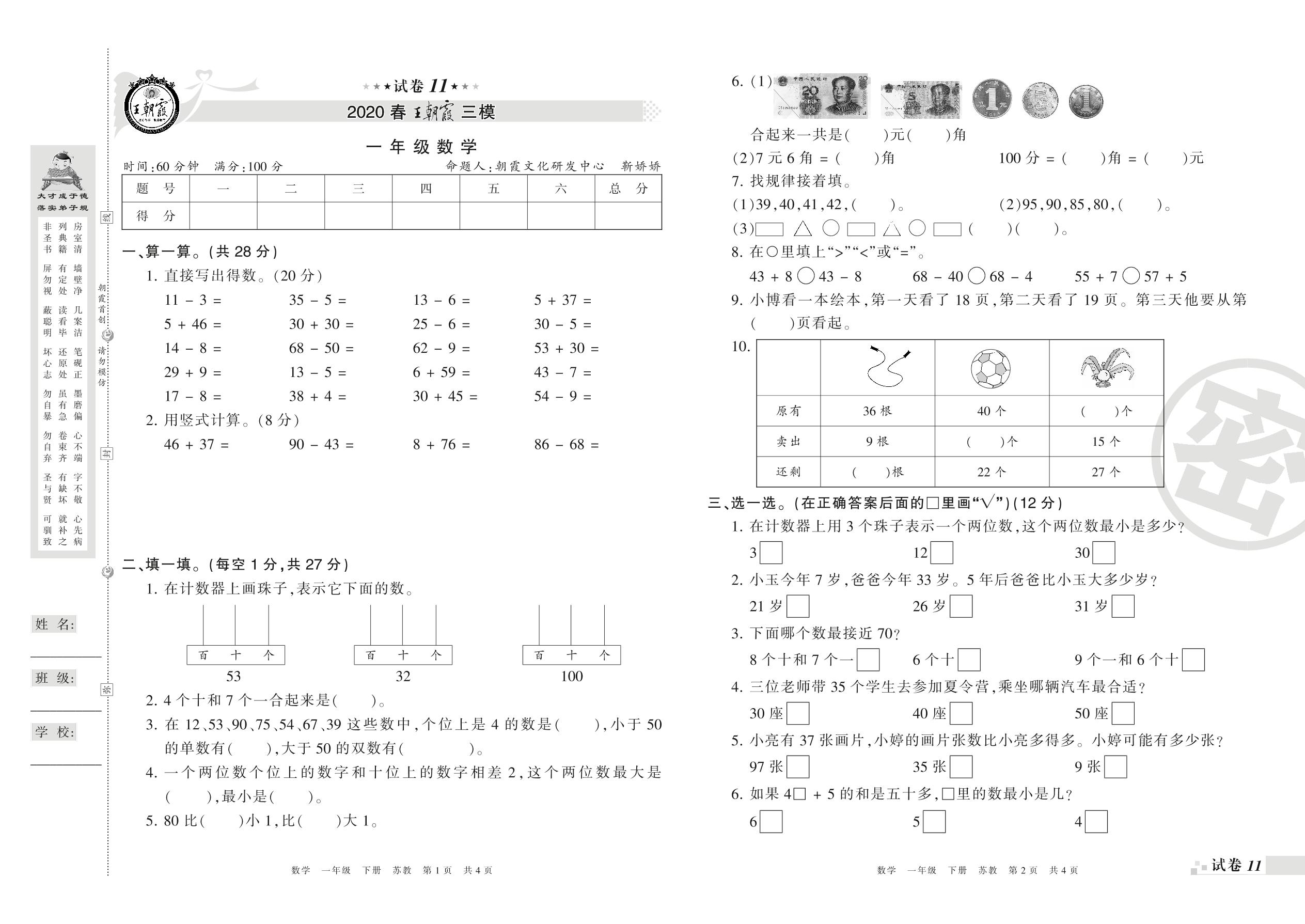 王朝霞期末模拟卷一年级下册数学(苏教版)_R210802214243【11】