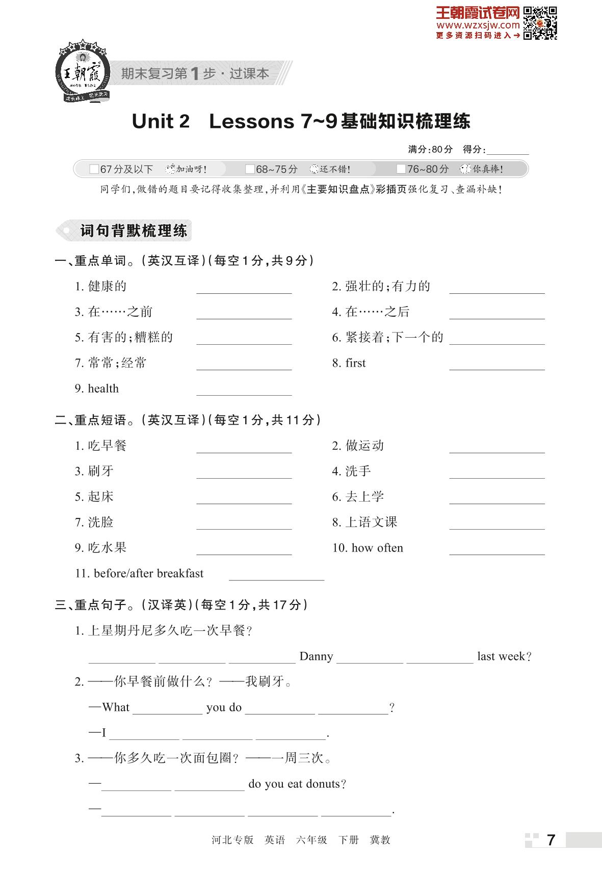 王朝霞期末过课本——Unit 2 Lessons 7~9 基础知识梳理练六年级下册英语(冀教版)