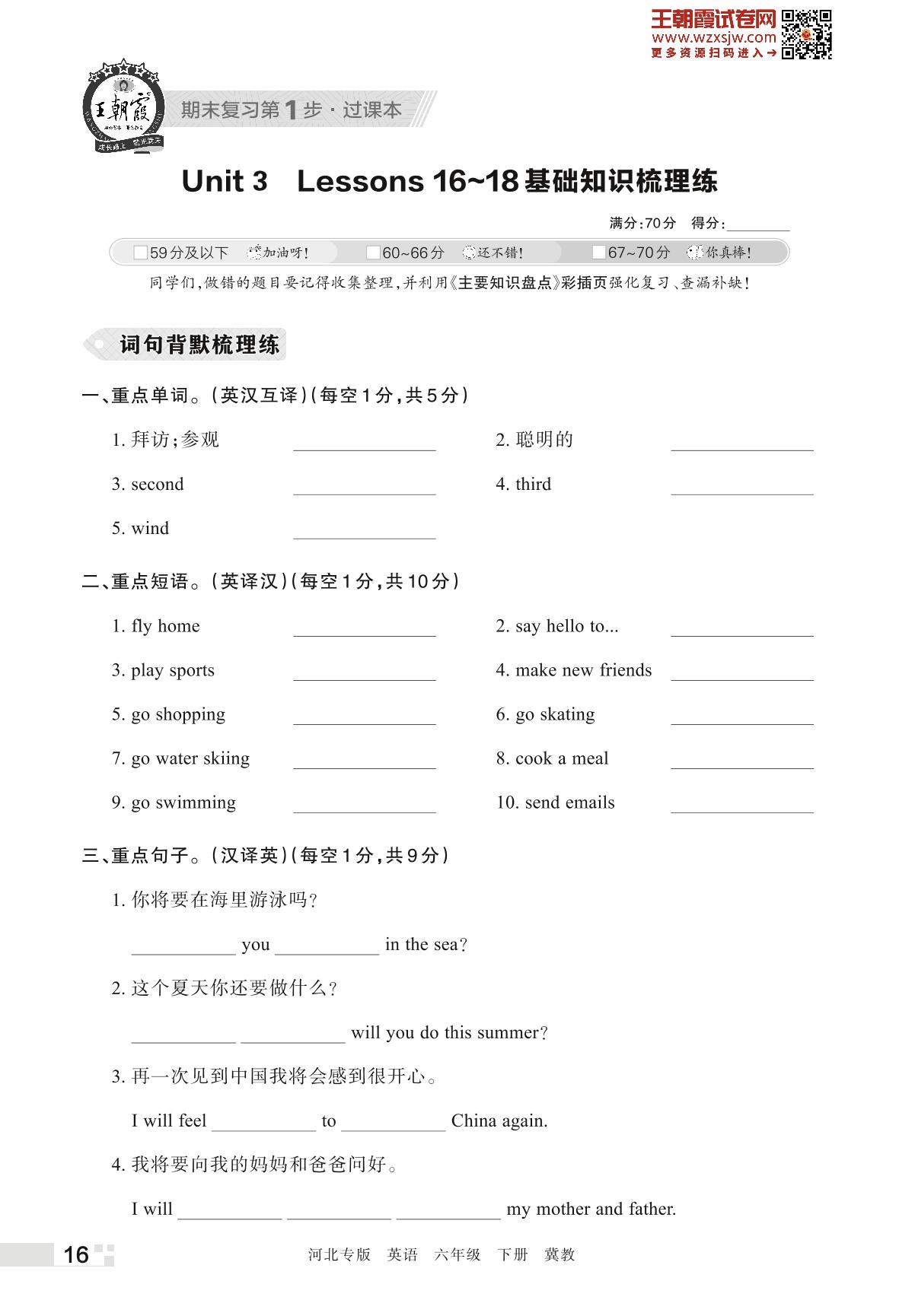 王朝霞期末过课本——Unit 3 Lessons 16~18 基础知识梳理练六年级下册英语(冀教版)