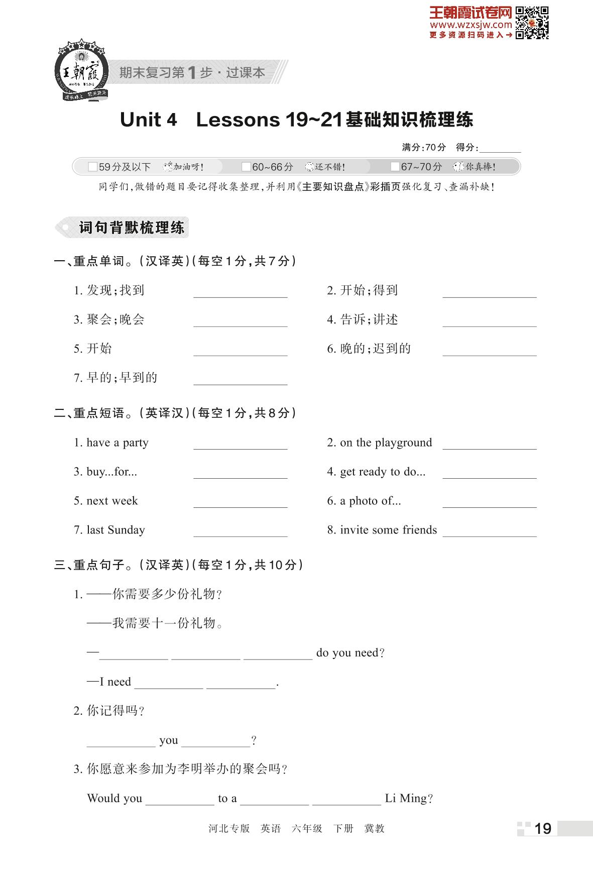 王朝霞期末过课本——Unit 4 Lessons 19~21 基础知识梳理练六年级下册英语(冀教版)