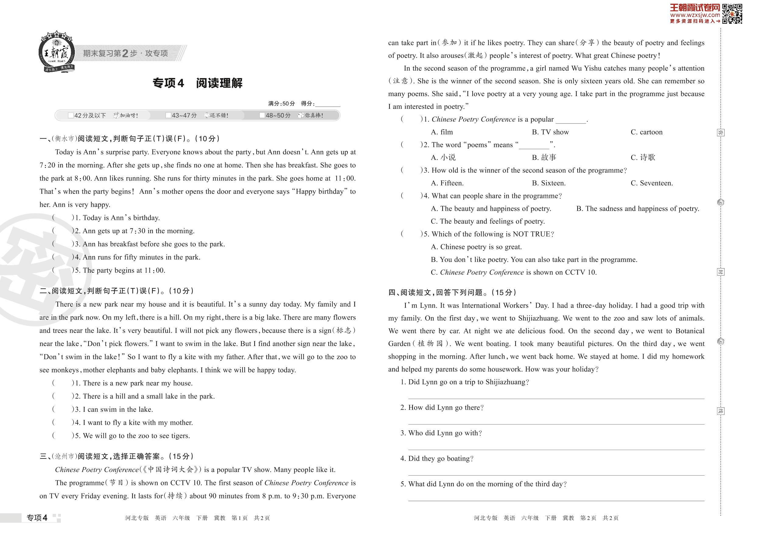 王朝霞期末专项卷——阅读理解六年级下册英语(冀教版)_R230419160253006【4】