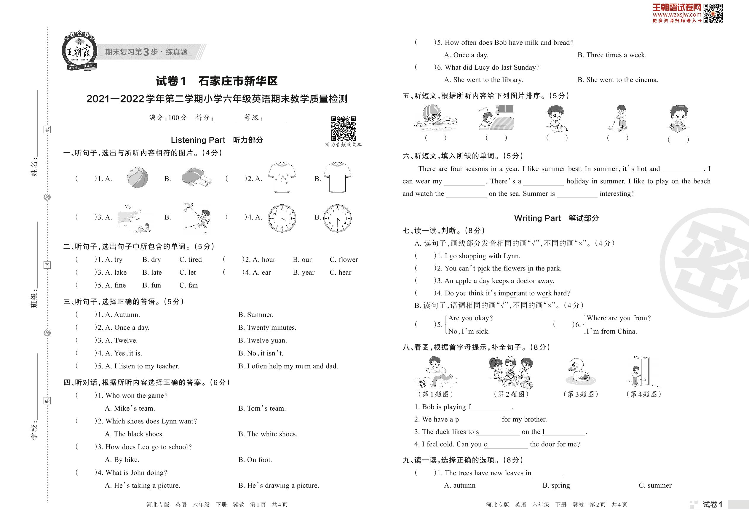 石家庄市新华区2021—2022学年第二学期小学六年级英语期末教学质量检测(冀教版)【1】