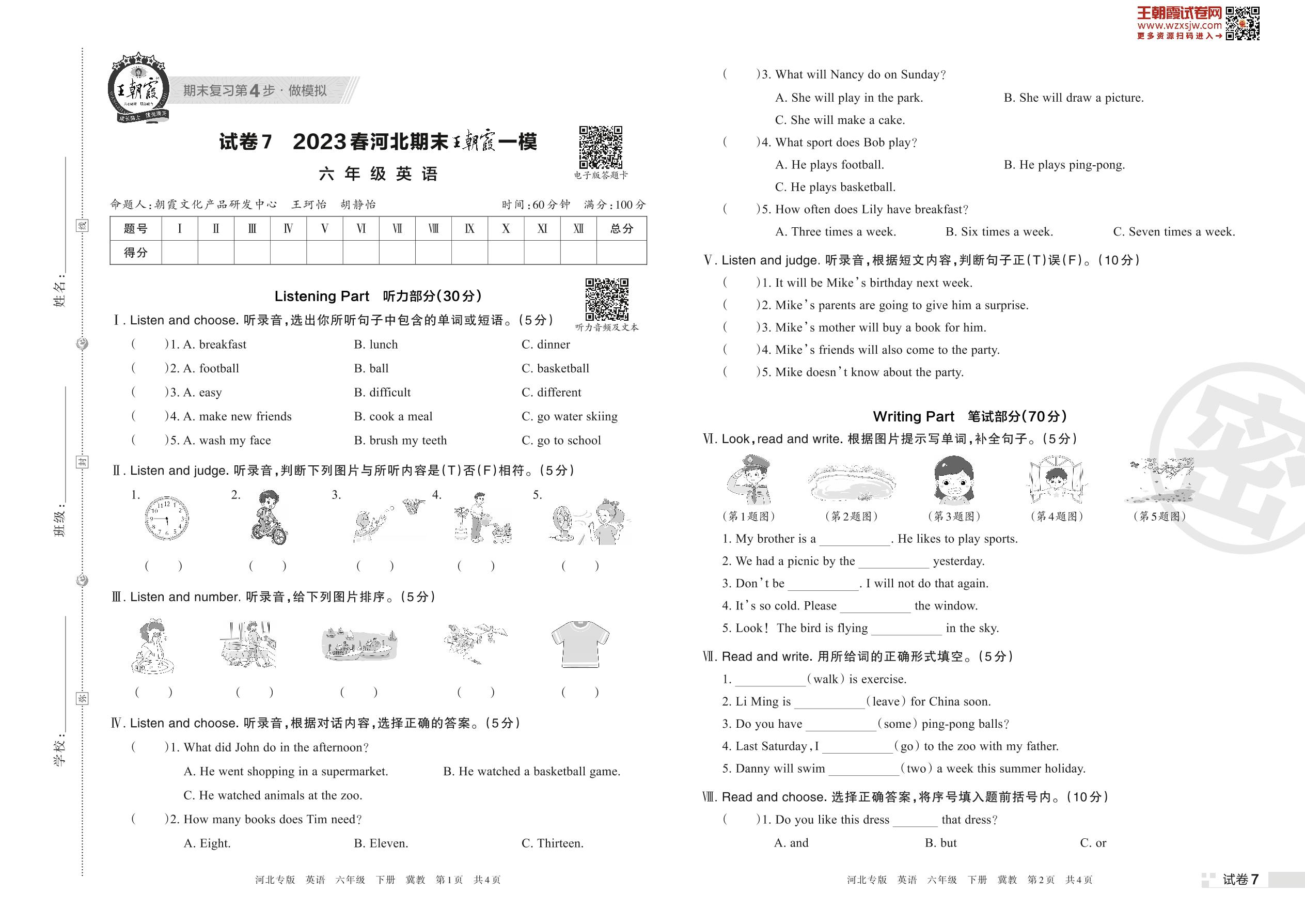 王朝霞期末模拟卷六年级下册英语(冀教版)_R230419160254404【7】