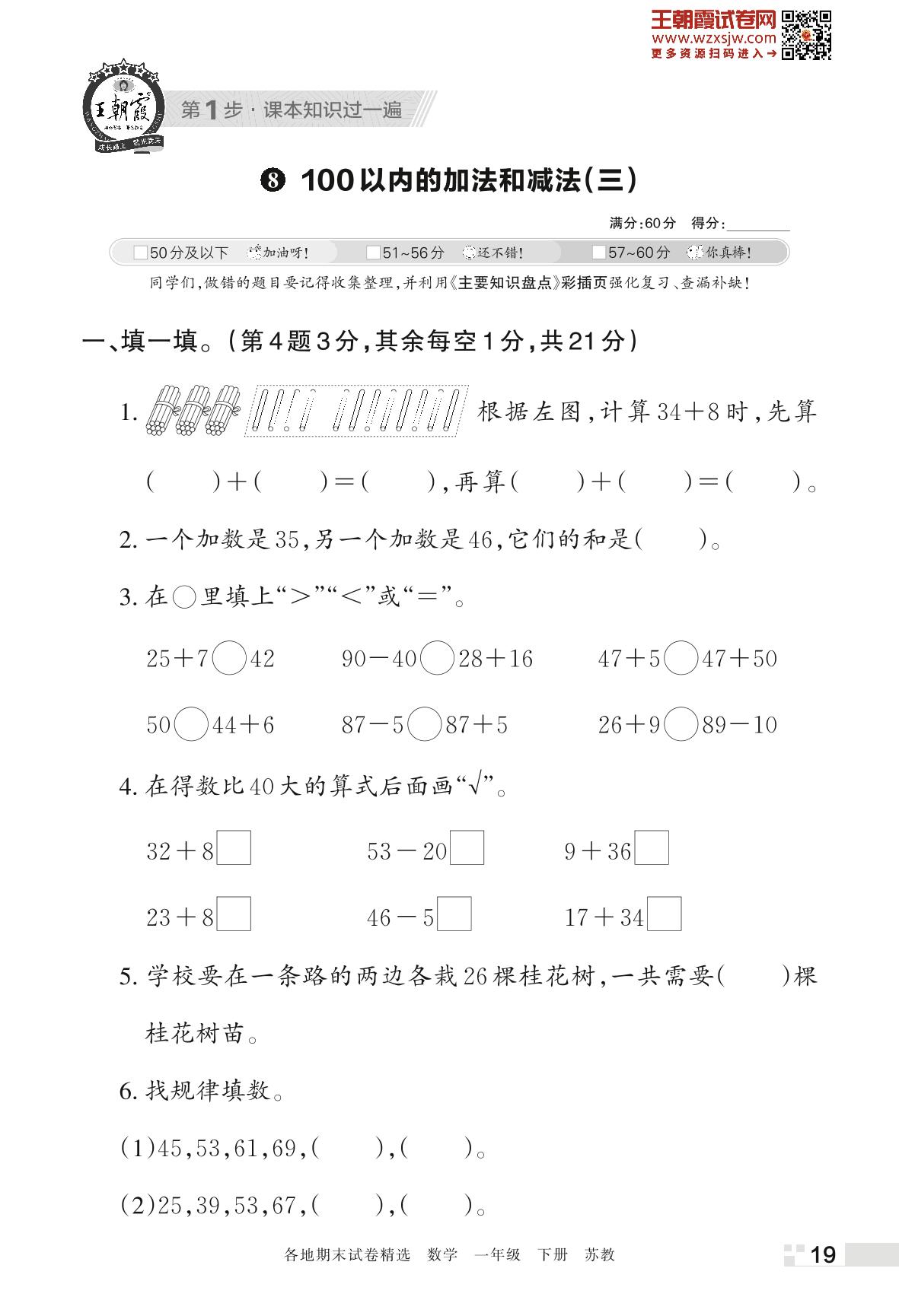 王朝霞期末过课本——8 100以内的加法和减法(三)一年级下册数学(苏教版)