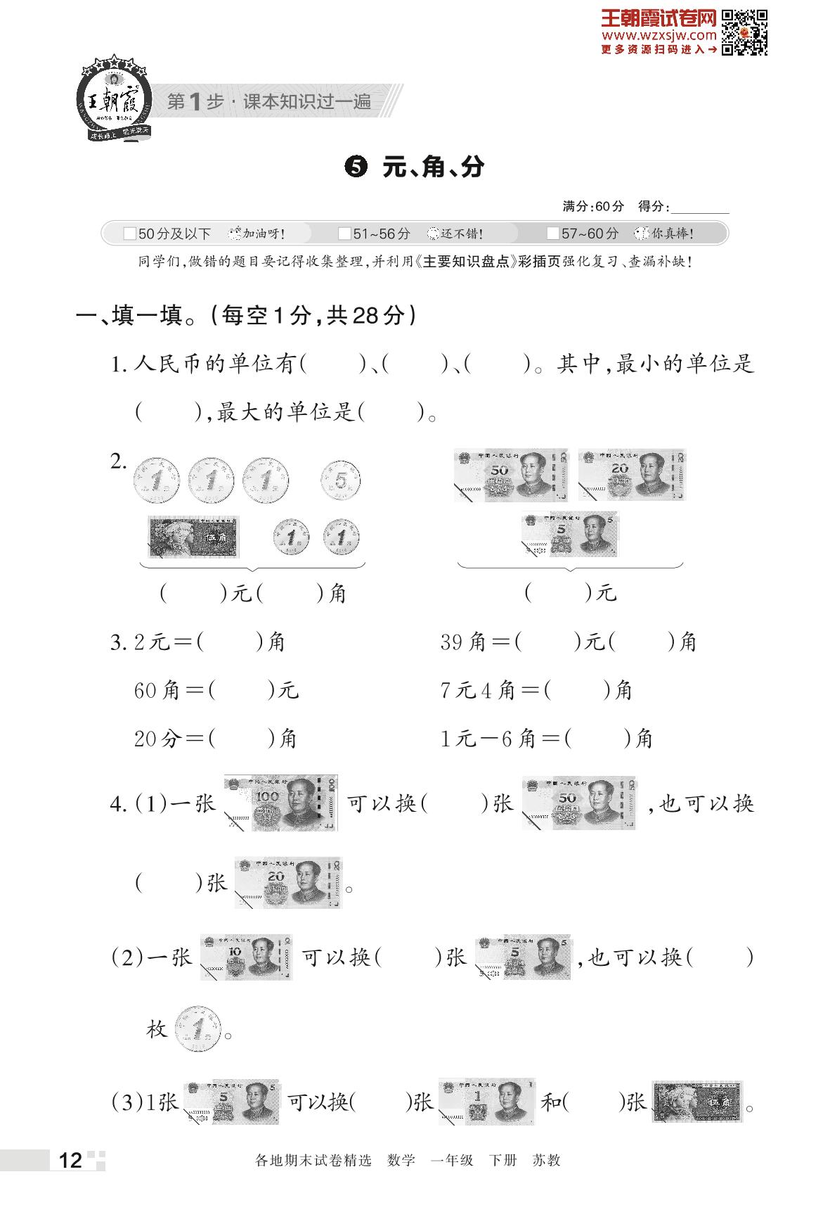 王朝霞期末过课本——5 元、角、分一年级下册数学(苏教版)