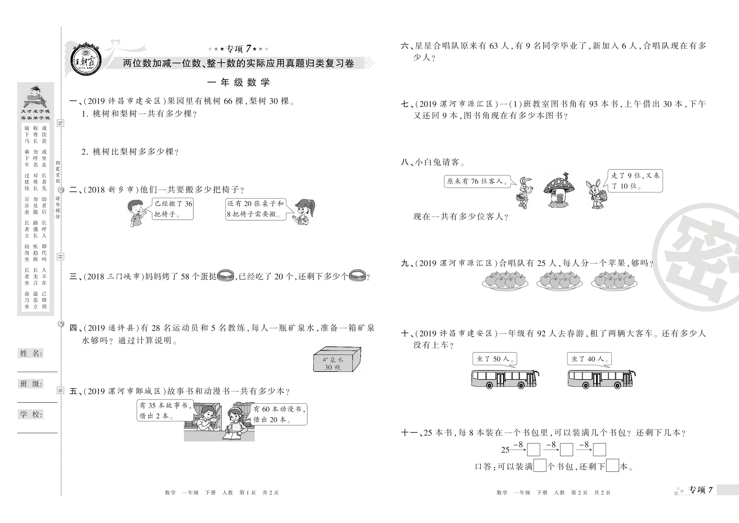 王朝霞期末专项卷——两位数加减一位数、整十数的实际应用真题归类复习卷、新颖题速递:生活与数学一年级下册数学(人教版)_R210802214300【0】