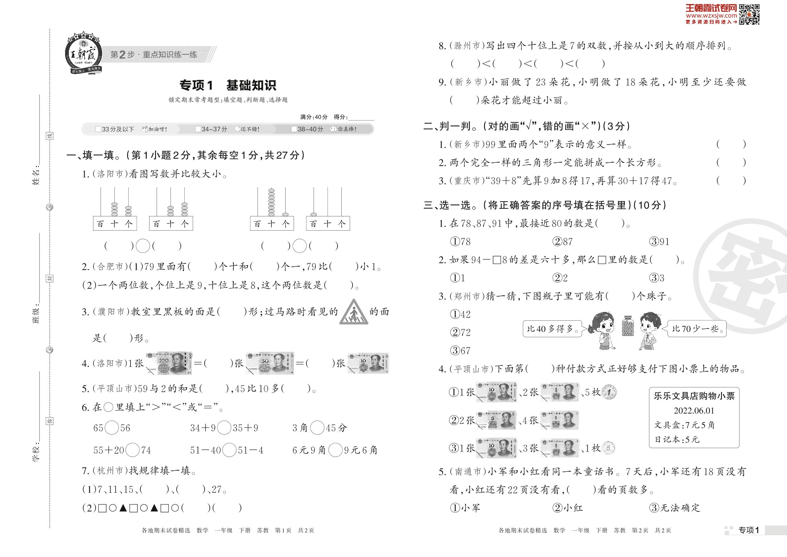 王朝霞期末专项卷——基础知识一年级下册数学(苏教版)_R230419161203849【1】