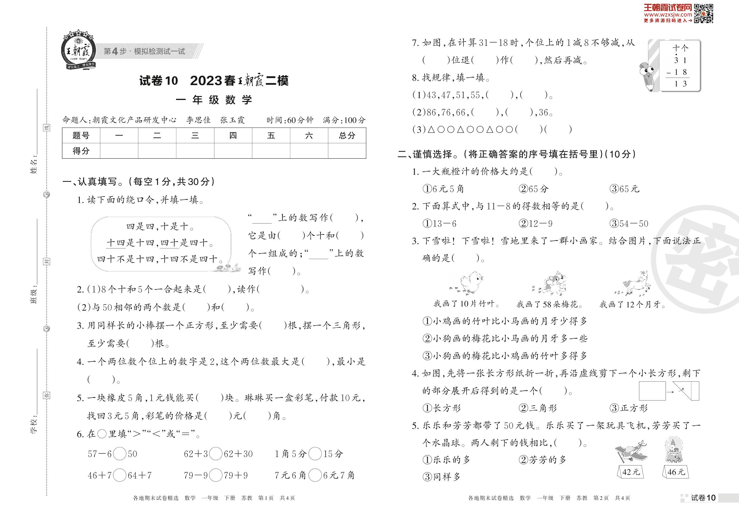 王朝霞期末模拟卷一年级下册数学(苏教版)【10】