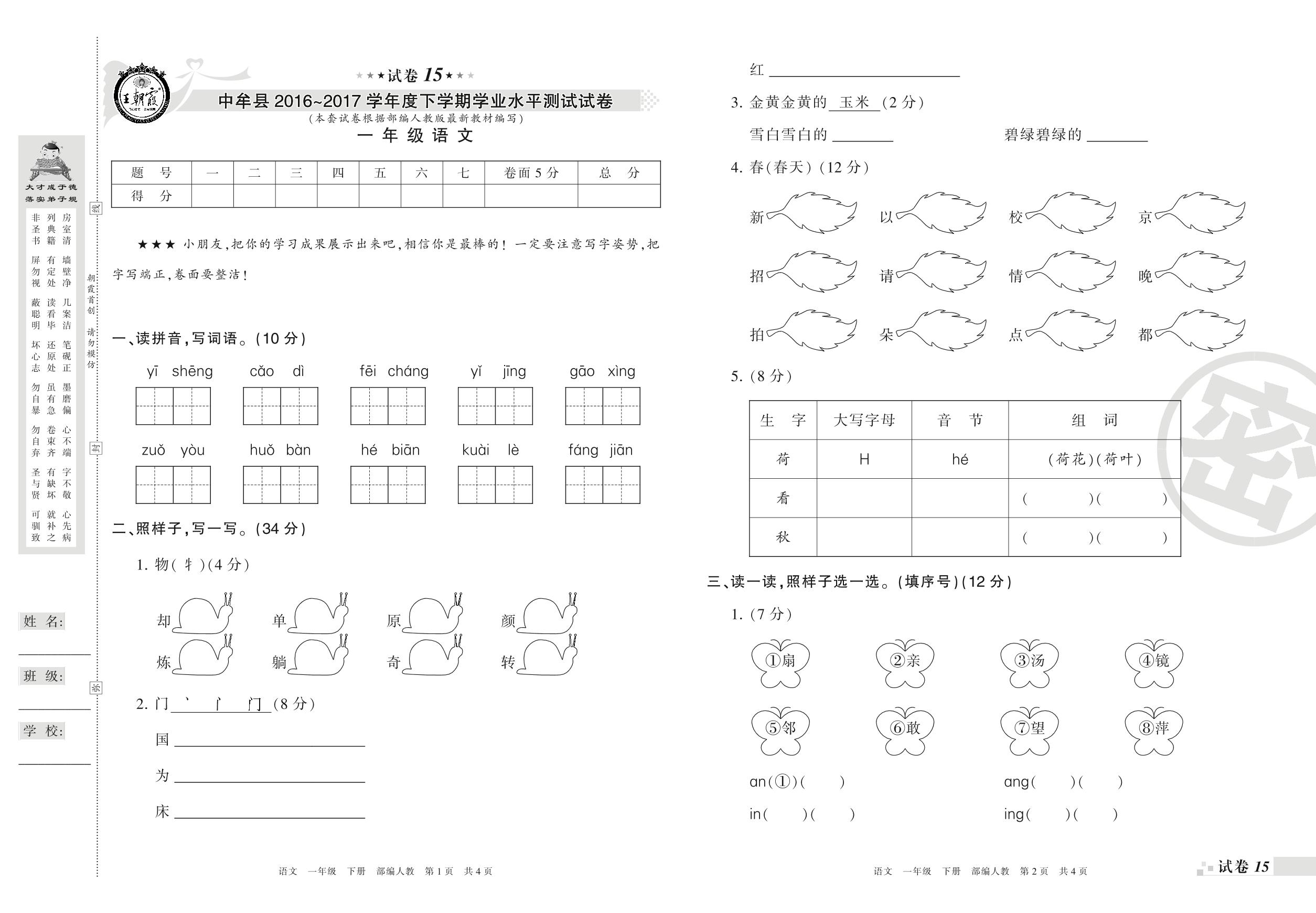 一年级语文人教版下册期末卷