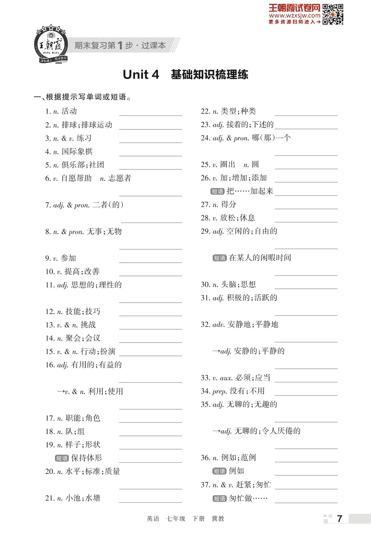 王朝霞期末过课本——Unit 4 基础知识梳理练七年级下册英语(冀教版)_R230419161208271