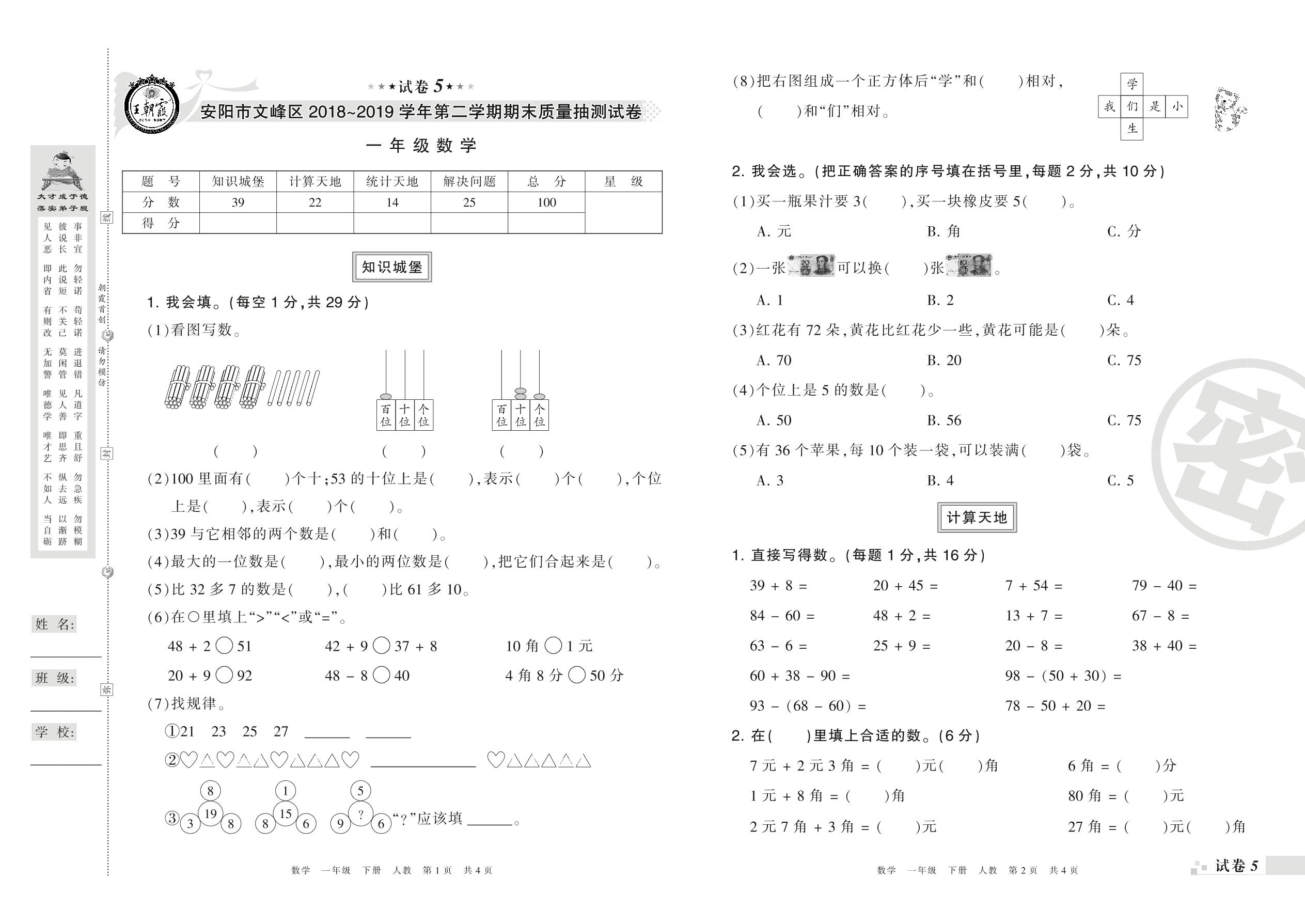 2018-2019学年第二学期安阳市文峰区一年级数学试卷(人教版)【5】