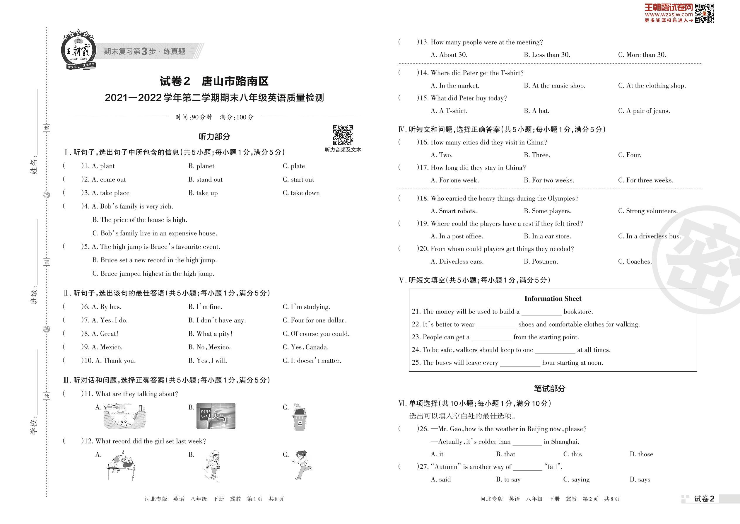 唐山市路南区2021—2022学年第二学期期末八年级英语质量检测(冀教版)【2】