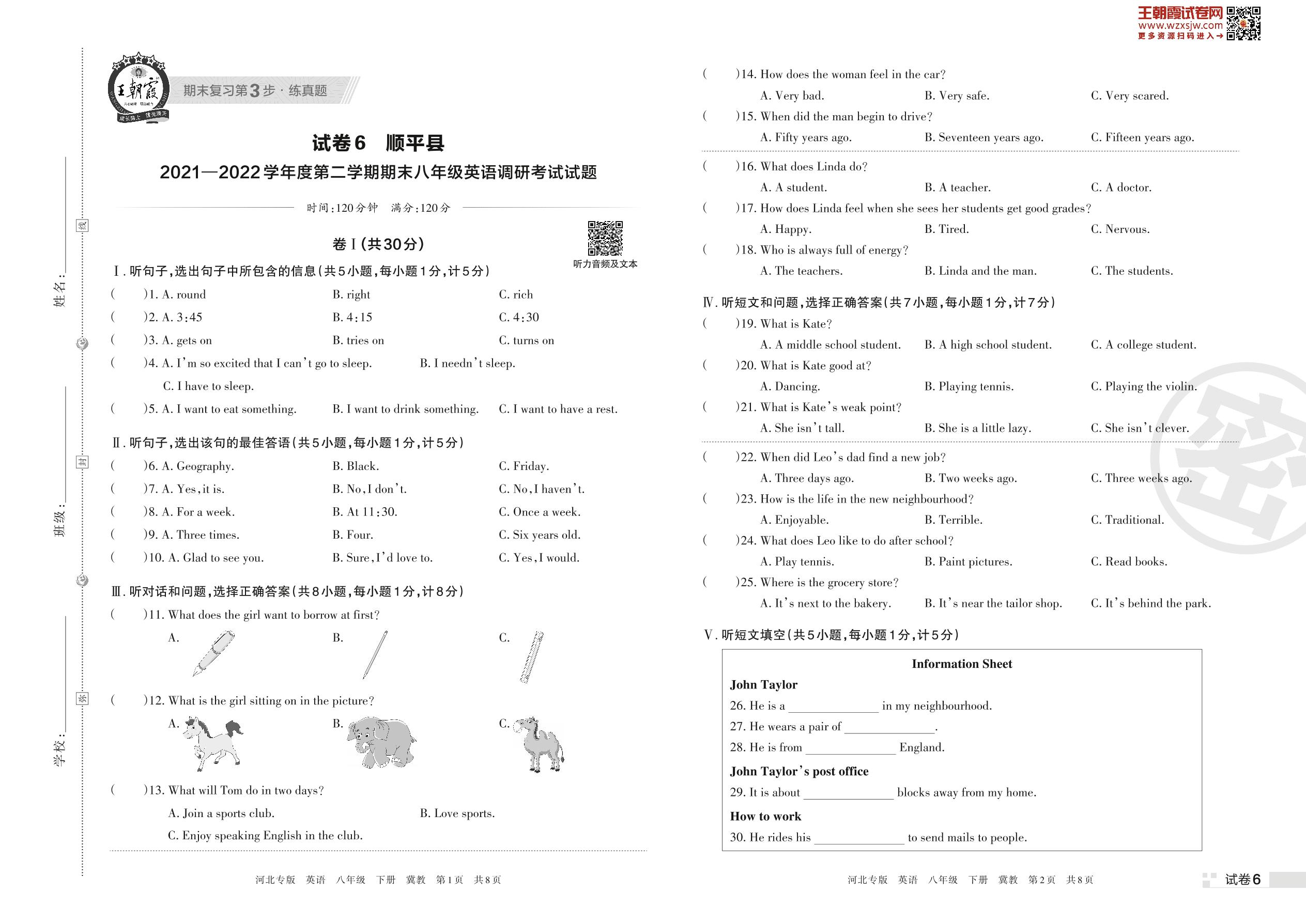 顺平县2021—2022学年度第二学期期末八年级英语调研考试试题(冀教版)【6】