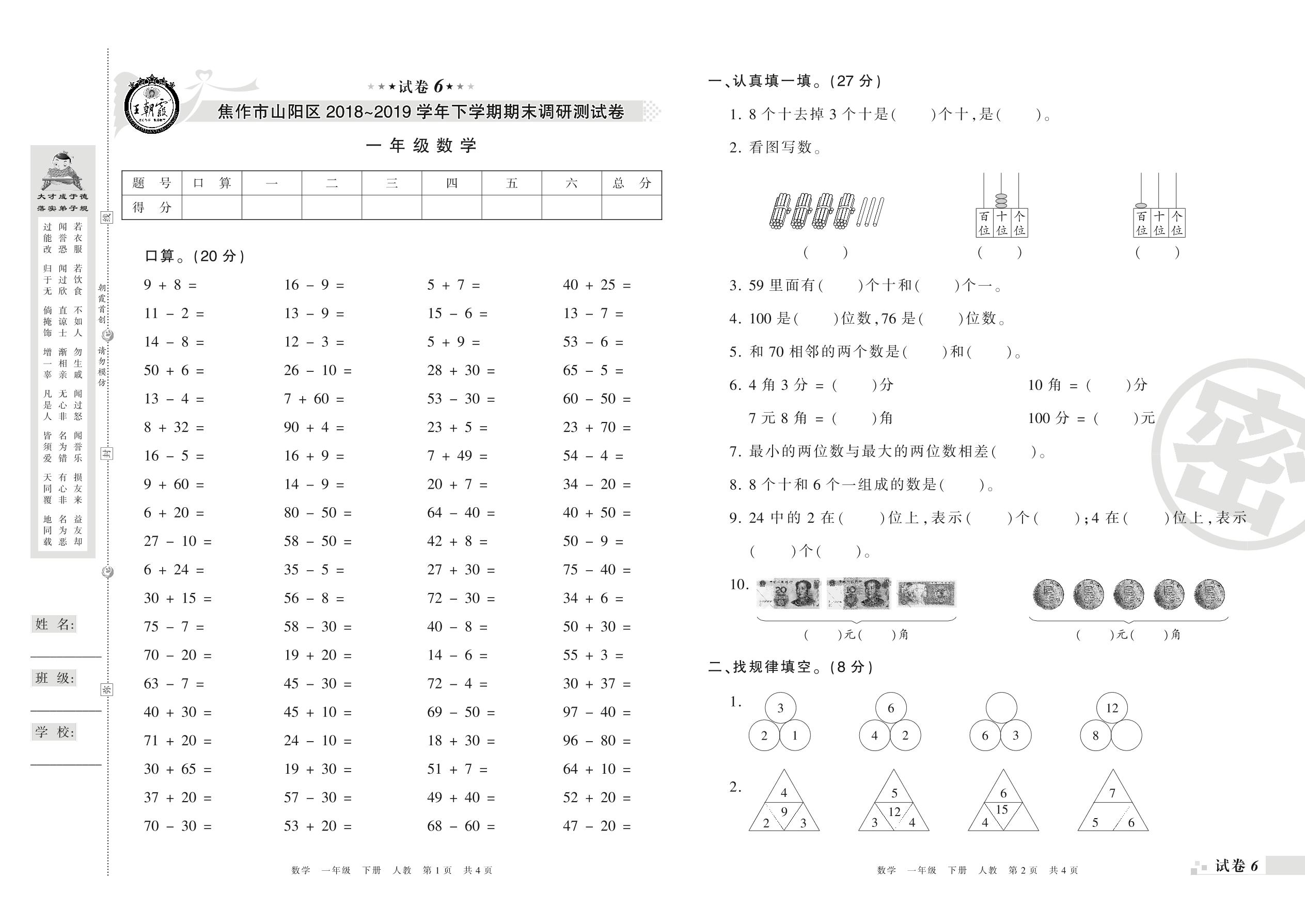 2018-2019学年第二学期焦作市山阳区一年级数学试卷(人教版)【6】