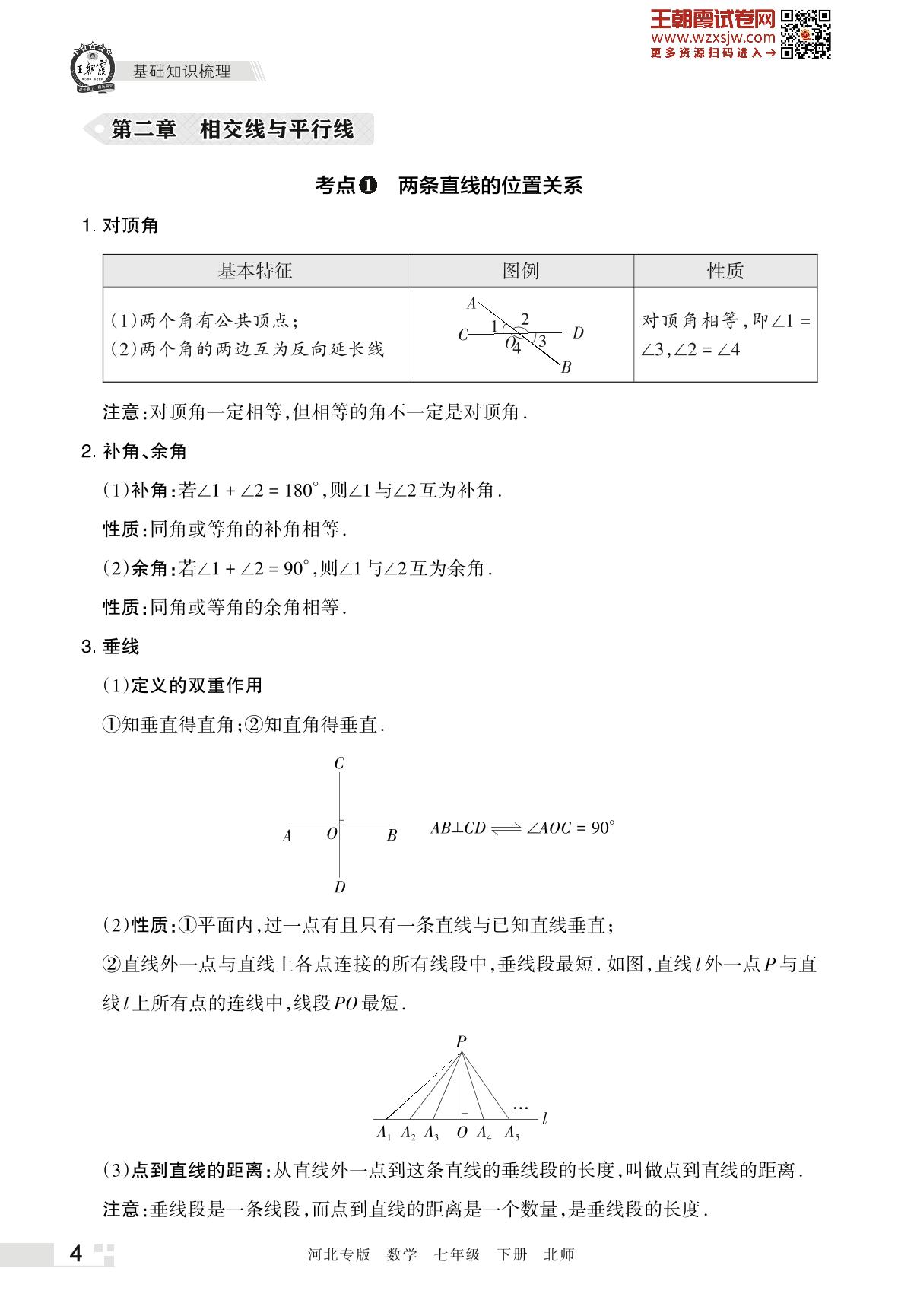 王朝霞期末知识梳理——第二章 相交线与平行线七年级下册数学(北师版)