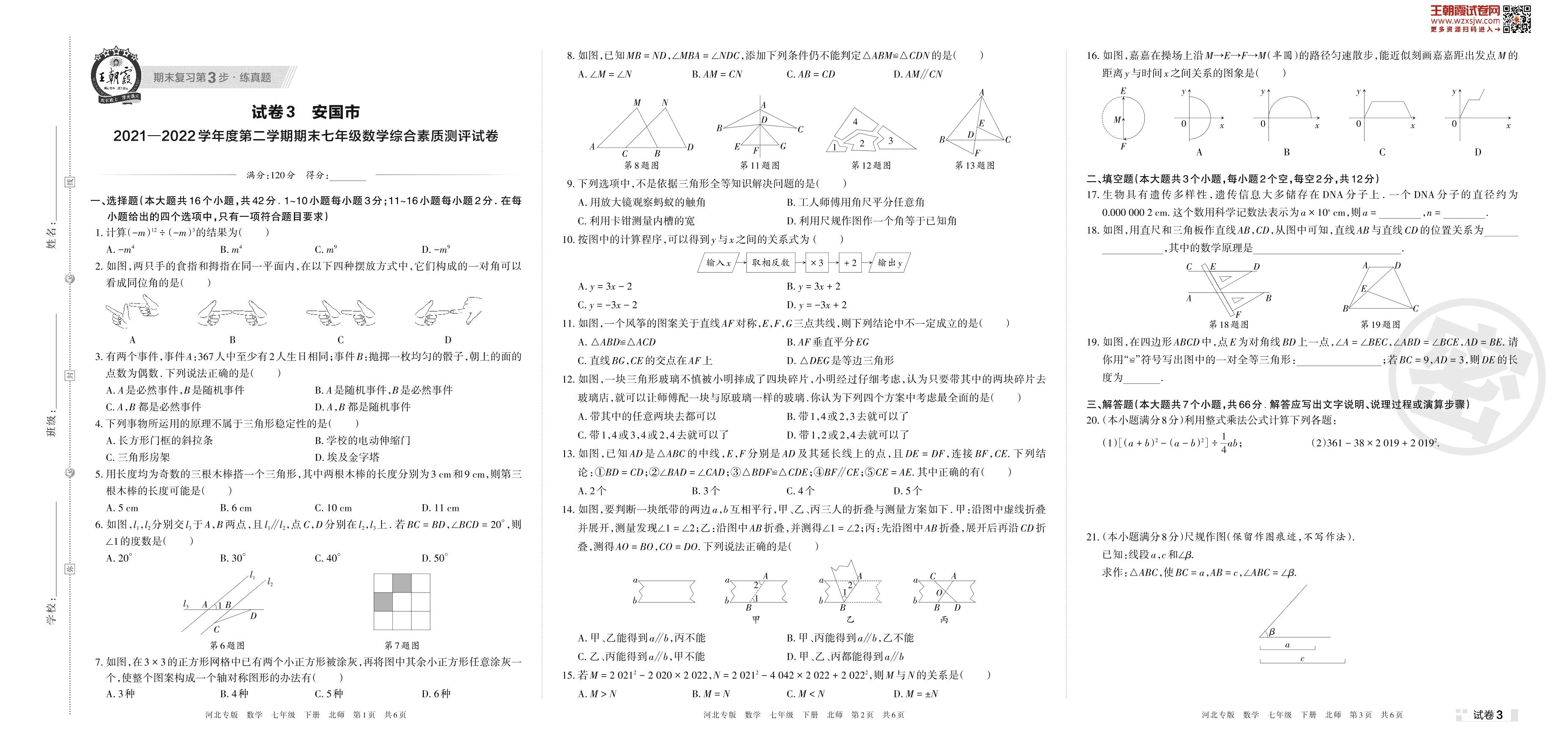 安国市2021—2022学年度第二学期期末七年级数学综合素质测评试卷(北师版)【3】