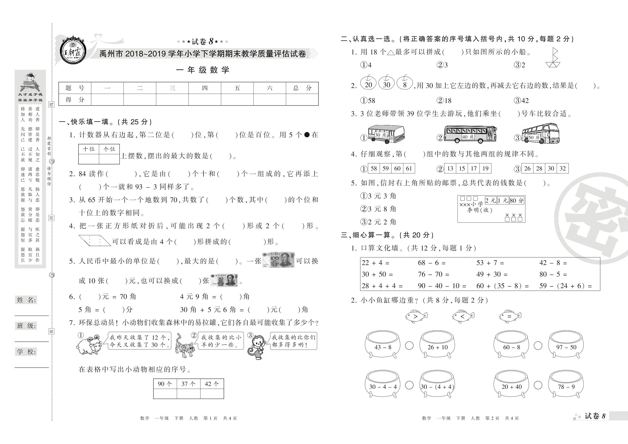 2018-2019学年第二学期禹州市一年级数学试卷(人教版)【8】