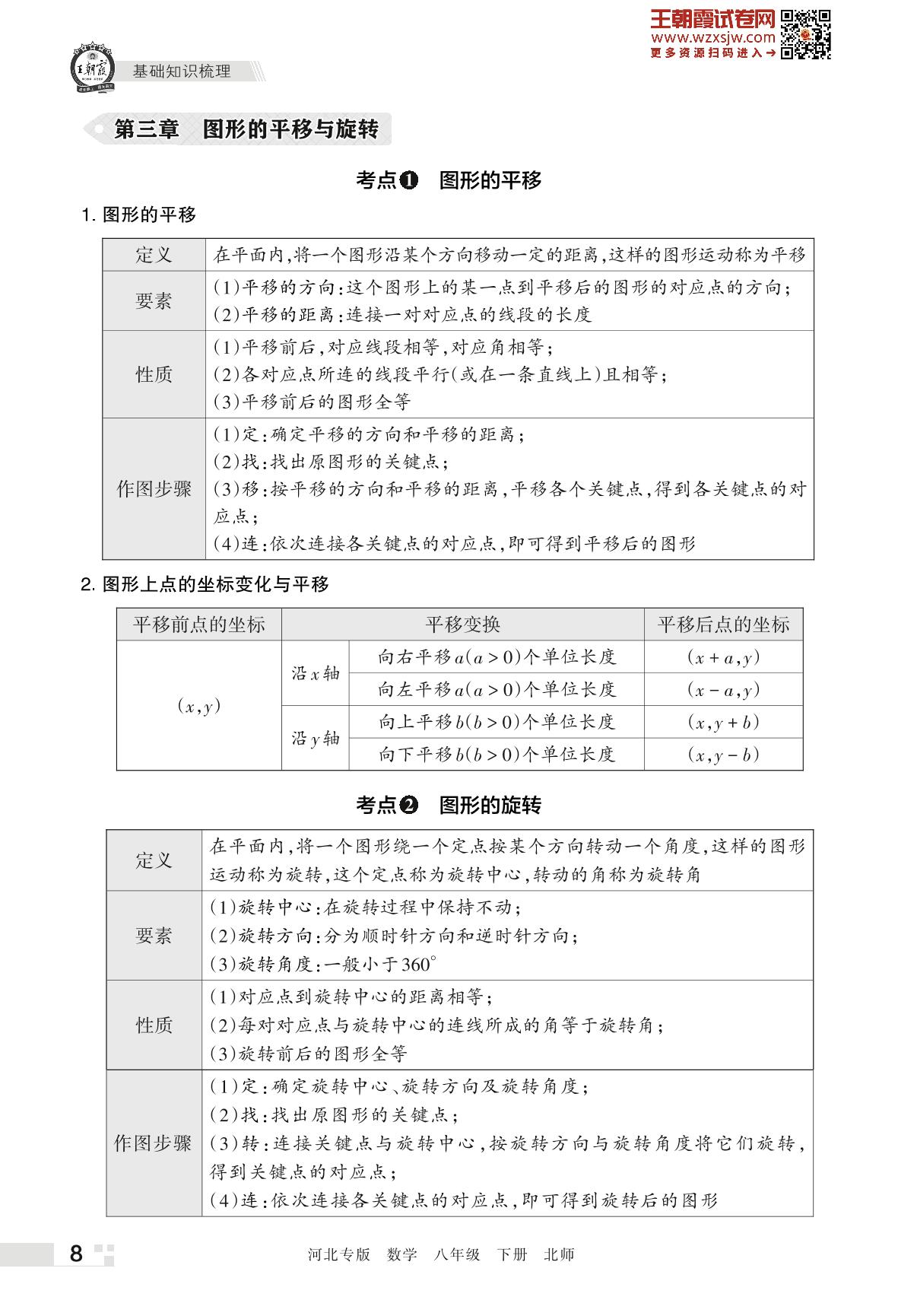 王朝霞期末知识梳理——第三章 图形的平移与旋转八年级下册数学(北师版)