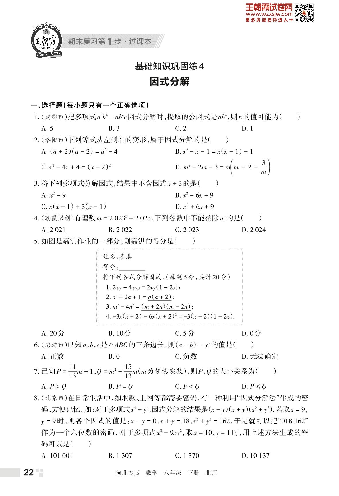王朝霞期末过课本——基础知识巩固练4 因式分解八年级下册数学(北师版)_R230419163404448