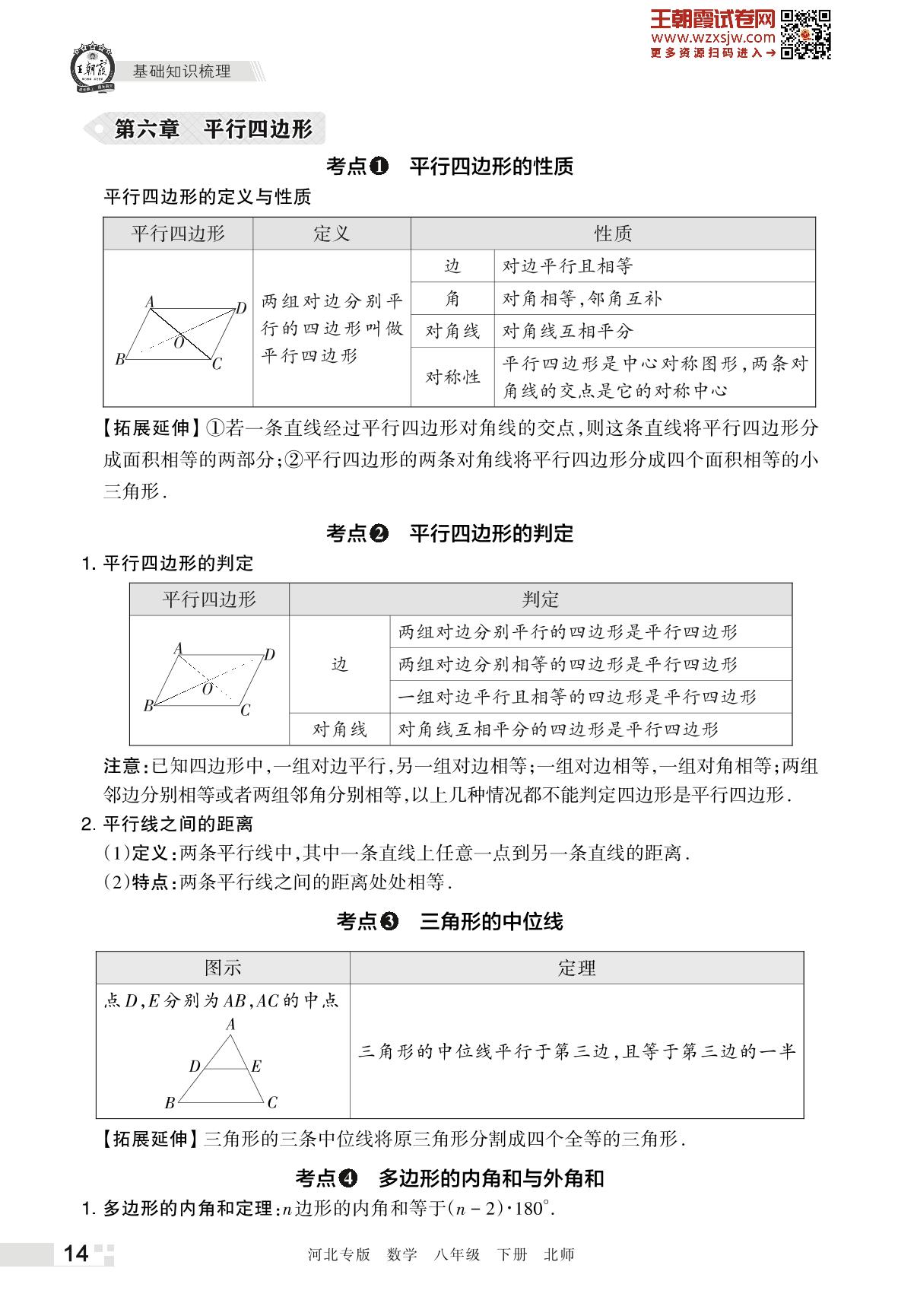 王朝霞期末知识梳理——第六章 平行四边形八年级下册数学(北师版)