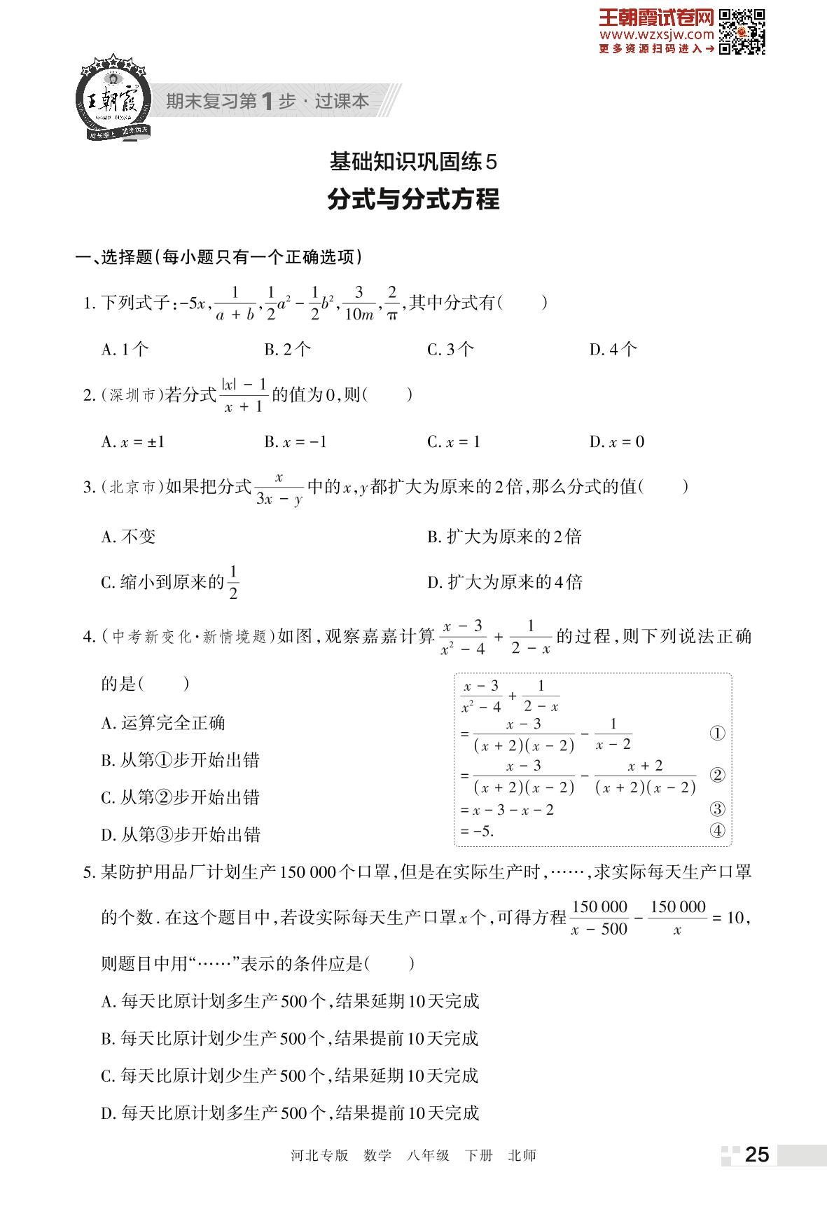 王朝霞期末过课本——基础知识巩固练5 分式与分式方程八年级下册数学(北师版)_R230419163405890