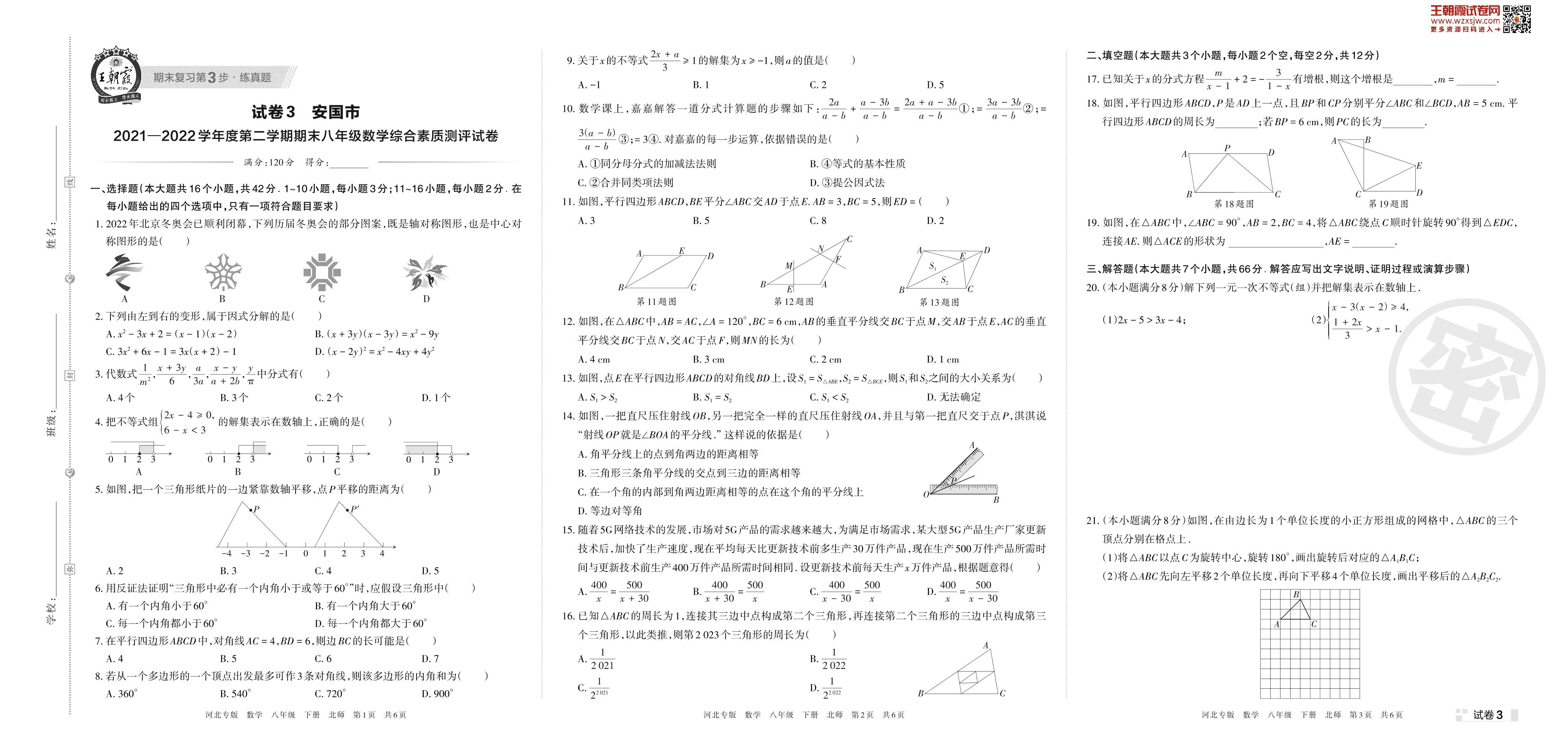 安国市2021—2022学年度第二学期期末八年级数学综合素质测评试卷(北师版)【3】