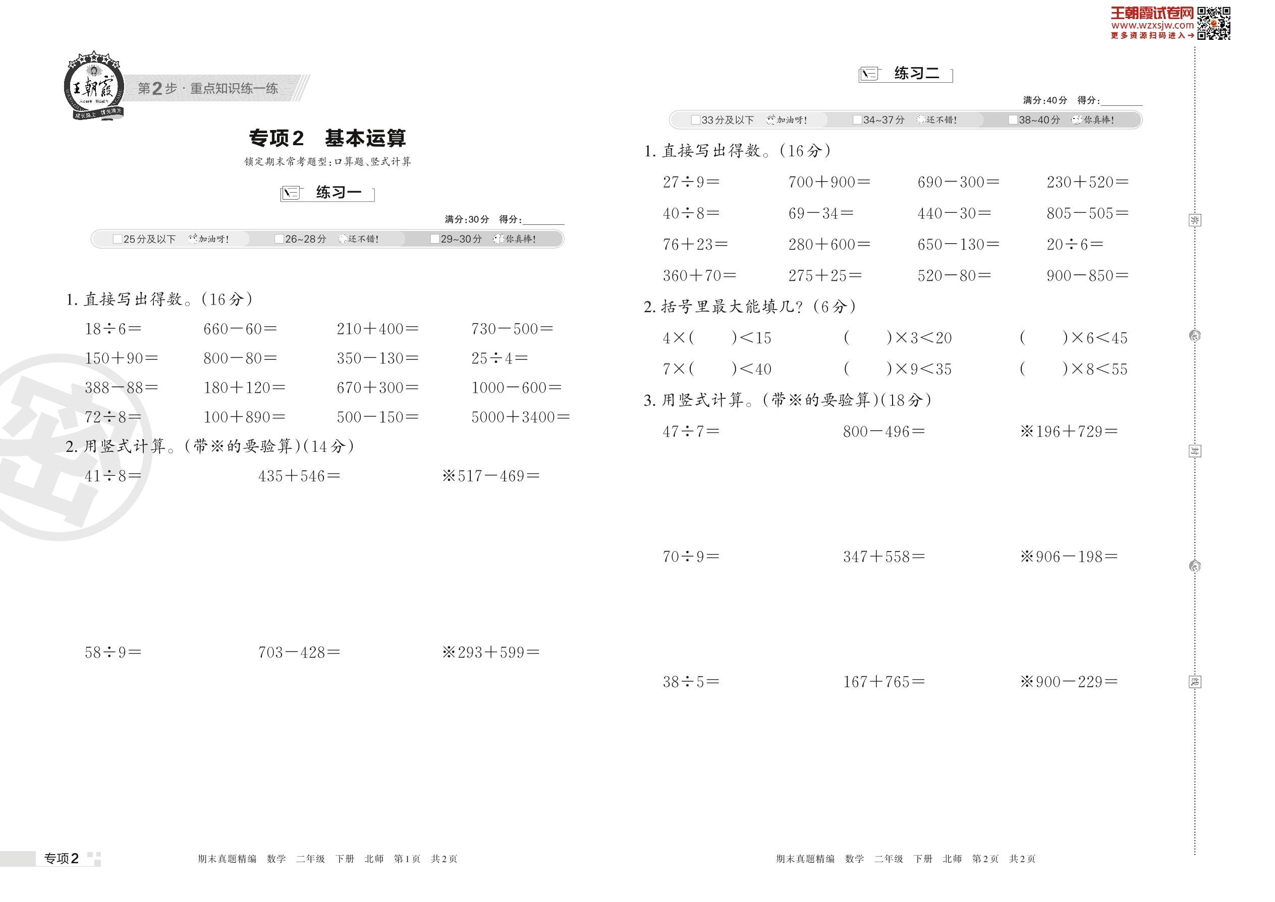 王朝霞期末专项卷——基本运算二年级下册数学(北师版)_R230419173444116【2】