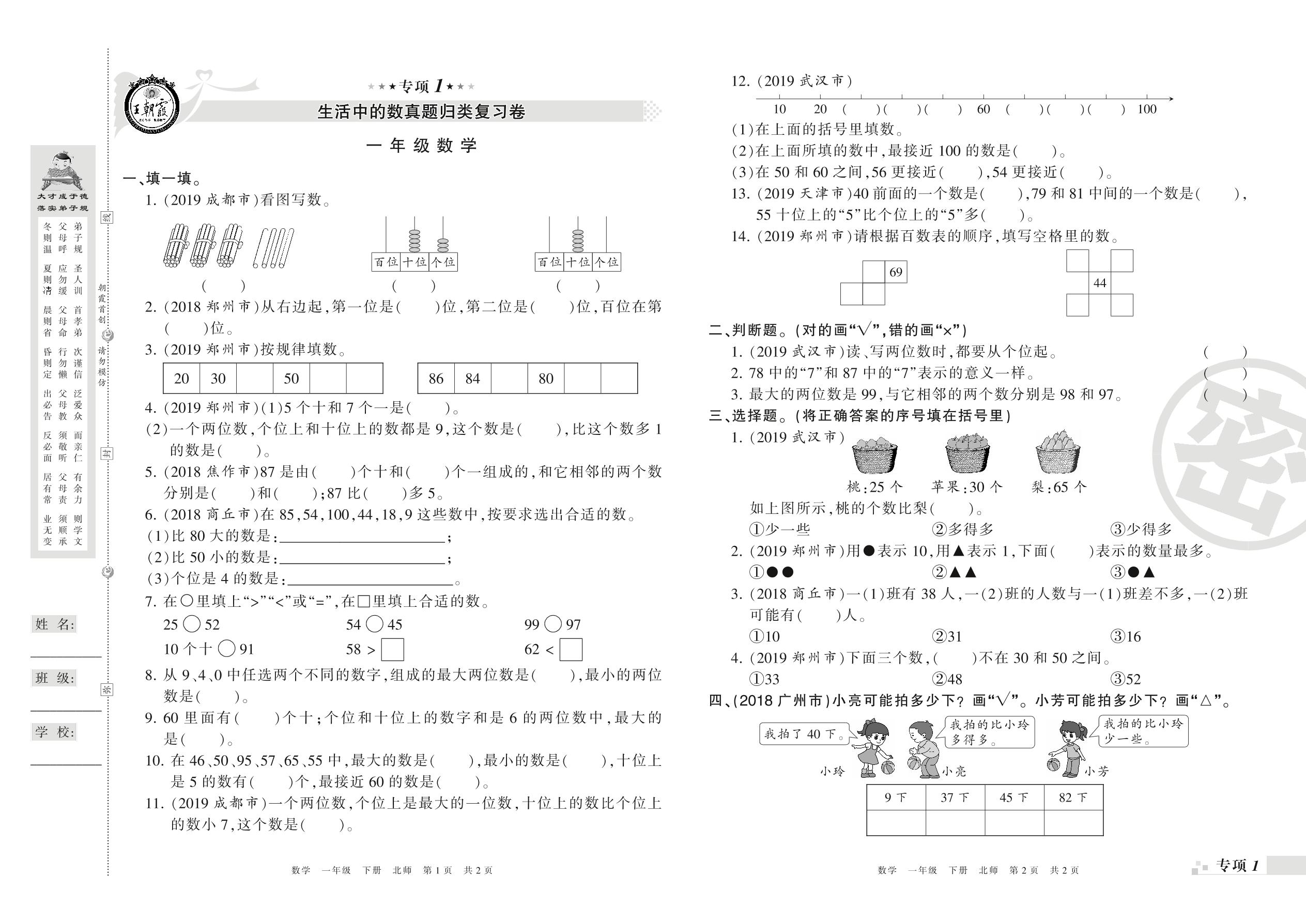 王朝霞期末专项卷——生活中的数、两位数加减一、两位数(不进退位)的计算真题归类复习卷一年级下册数学(北师版)_R210802214352【0】