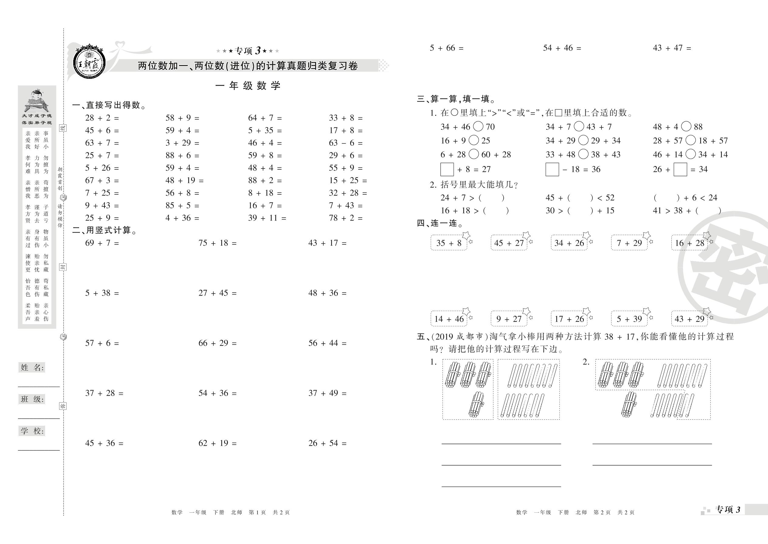 王朝霞期末专项卷——两位数加一、两位数(进位)的计算、两位数减一、两位数(退位)的计算真题归类复习卷一年级下册数学(北师版)_R210802214356【0】
