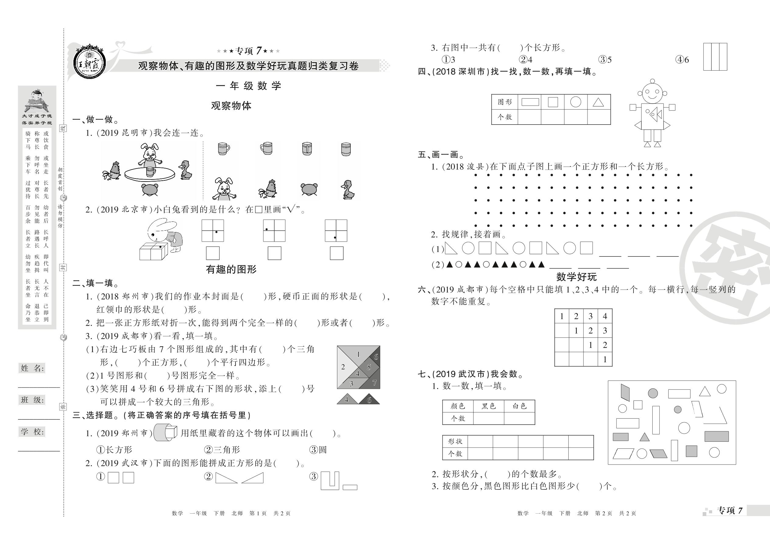 王朝霞期末专项卷——观察物体、有趣的图形及数学好玩真题归类复习卷、新颖题速递:生活与数学一年级下册数学(北师版)_R210802214403【0】