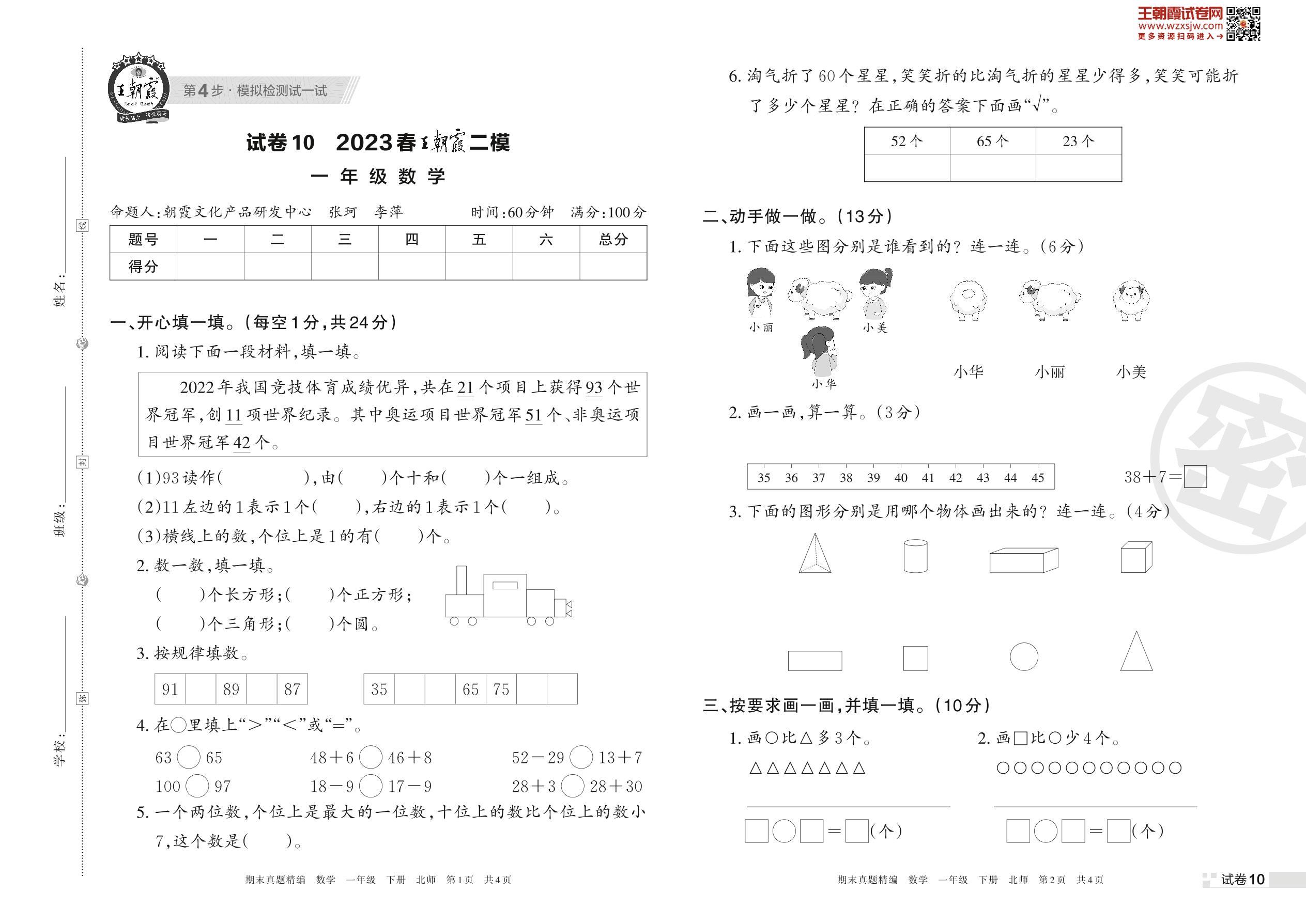王朝霞期末模拟卷一年级下册数学(北师版)_R230420105655437【10】