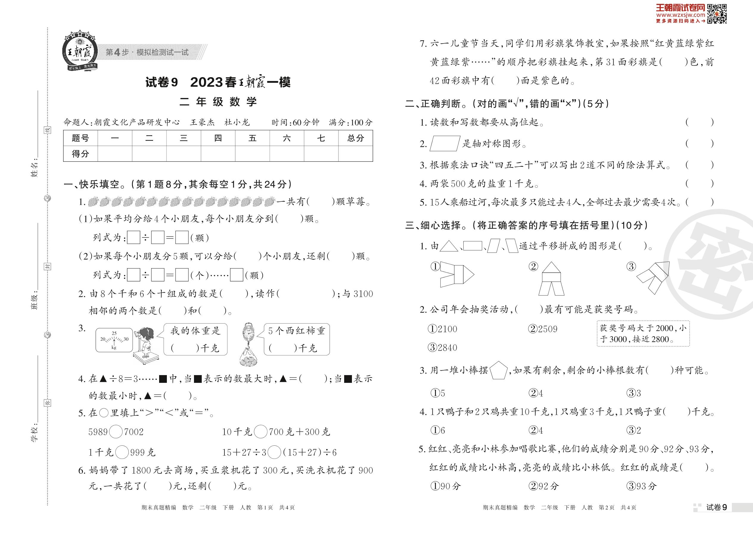 王朝霞期末模拟卷二年级下册数学(人教版)_R230420110358410【9】