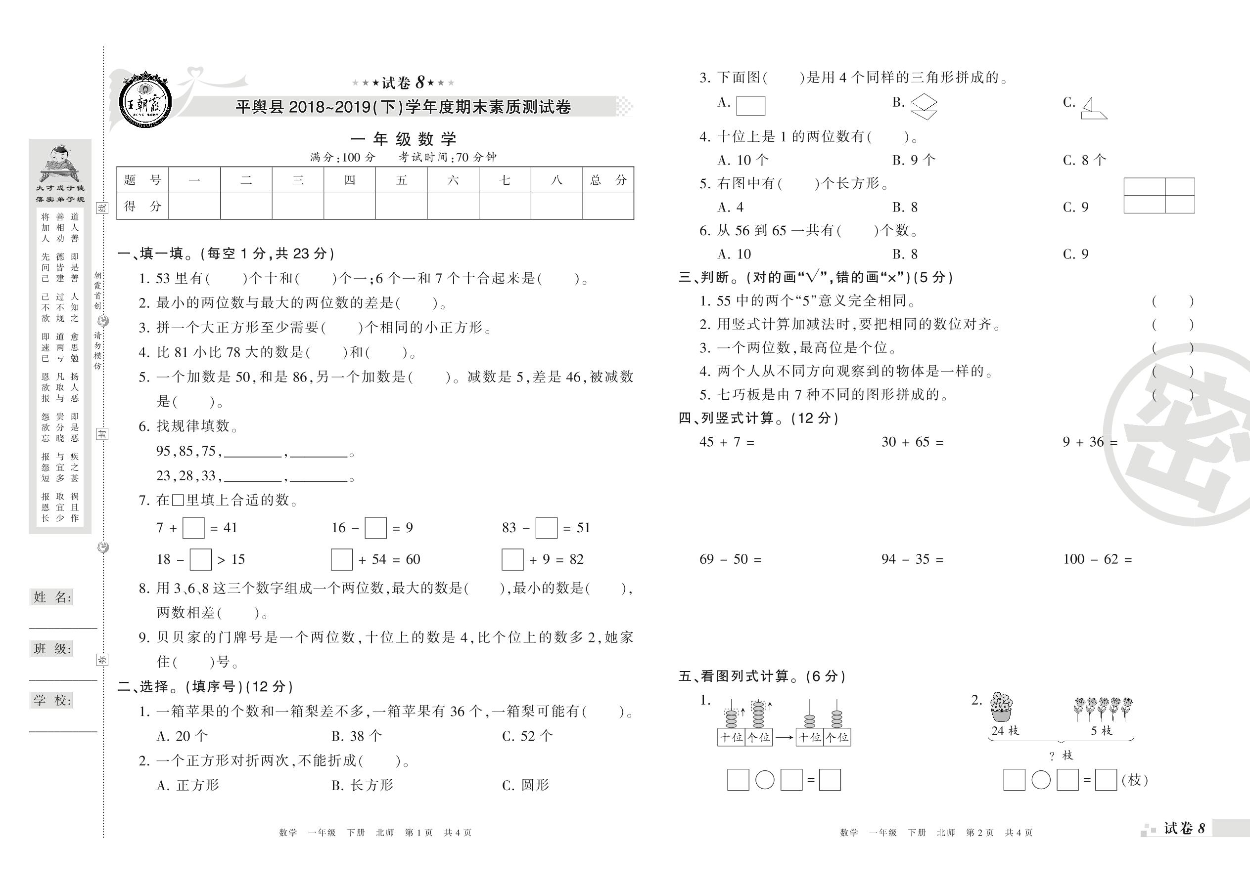 2018-2019学年第二学期驻马店市平舆县一年级数学试卷(北师版)【8】