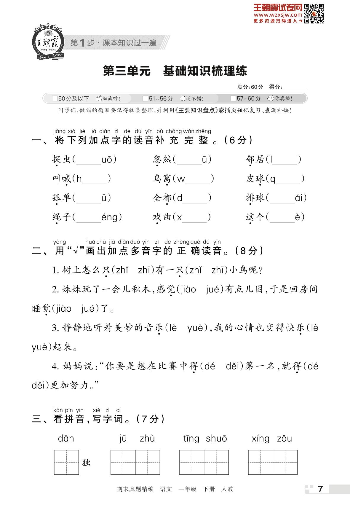 王朝霞期末过课本——第三单元 基础知识梳理练一年级下册语文(人教版)_R230420115424104