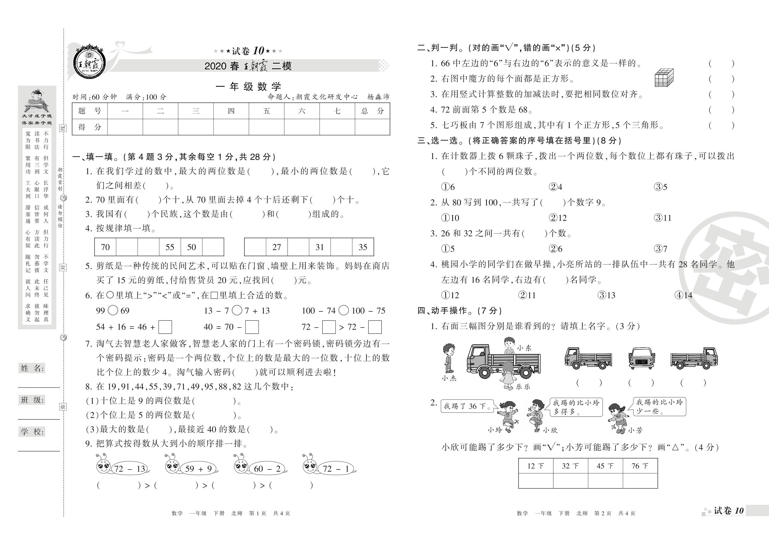 王朝霞期末模拟卷一年级下册数学(北师版)_R210802214435【10】