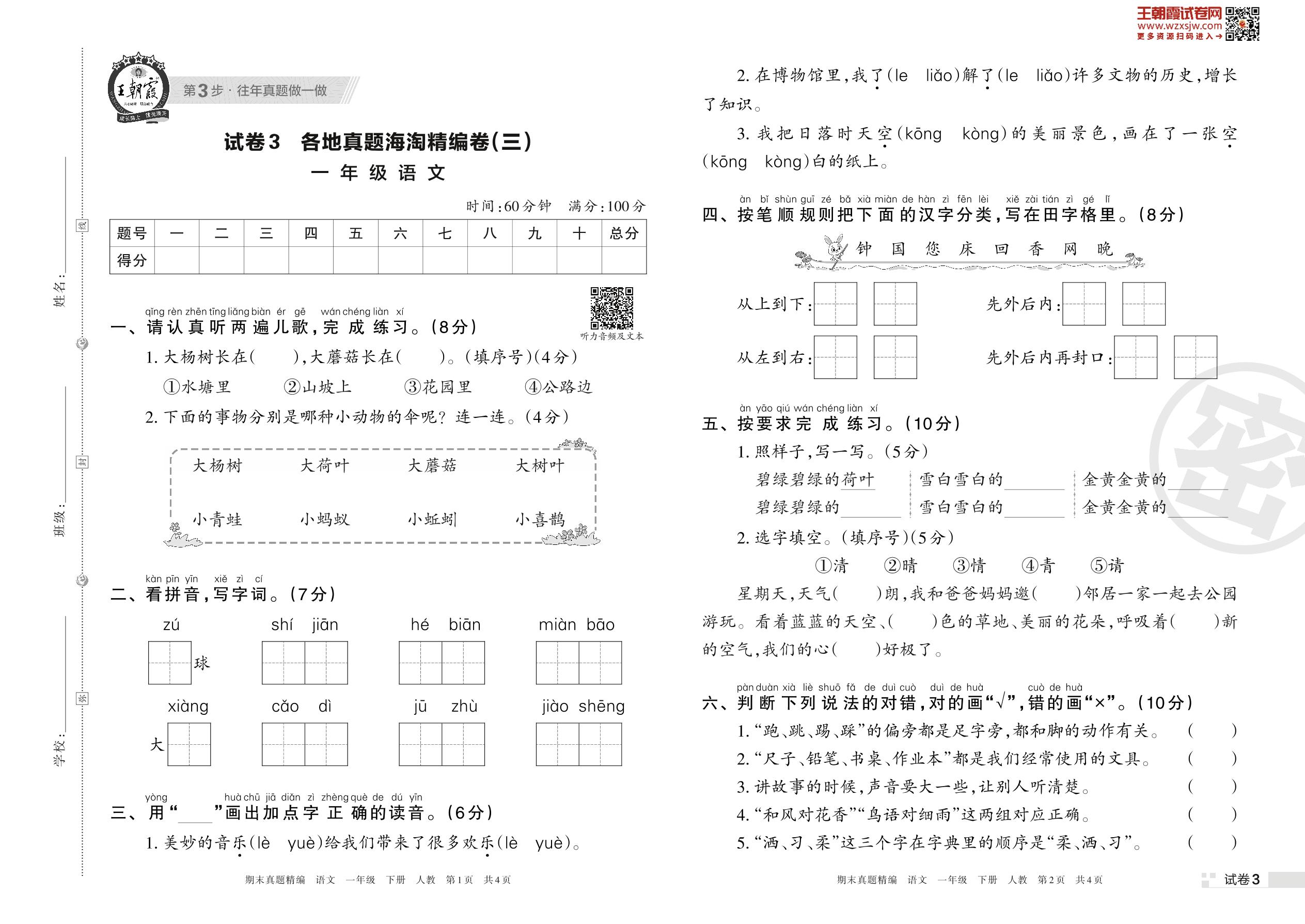 一年级语文人教版下册期末卷